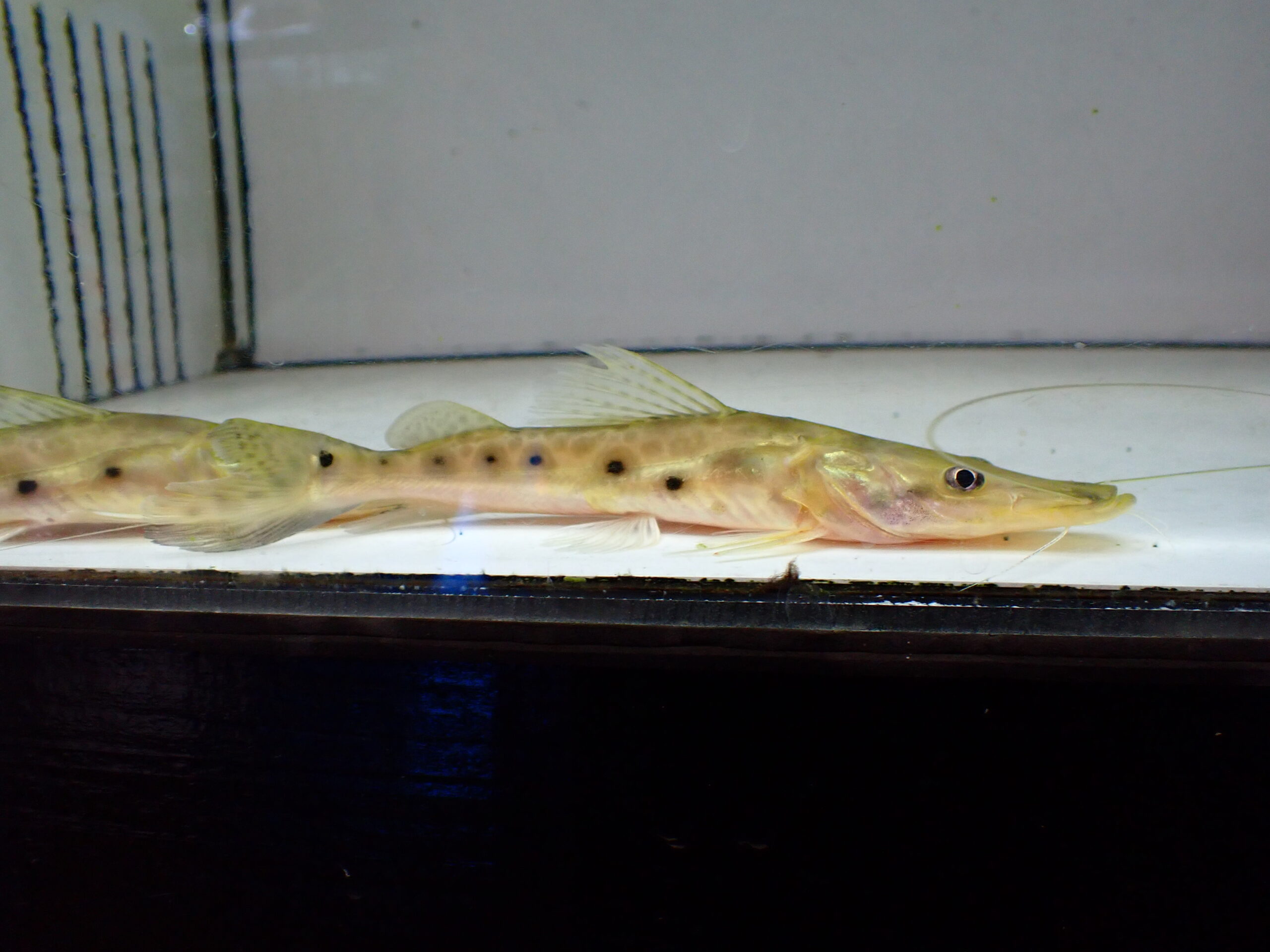 久し振りのエイティーンスポットです!今回はコロンビアのイニリダ川産の個体です。ペルー、コロンビア、ブラジルと広域に分布しているナマズなのに輸入されるのは稀で滅多に入荷しません。去年だったか一昨年だったかペルー産のベビーがまとまって輸入されたことがありましたが、その時の個体はなぜかみんな上アゴが出てたんですよね・・・。でも本来エイティーンスポットシャベルノーズは下アゴ出てるんです。で、今回のイニリダの個体たちですが、安心してください!ちゃんと下アゴ出てます!複数匹入荷していますが数は多くありません。問屋さんからは輸入されたのも僅かで10匹程だと聞いています。なので売り切れても再入荷の予定はありませんのでマニアの方はお早めに!