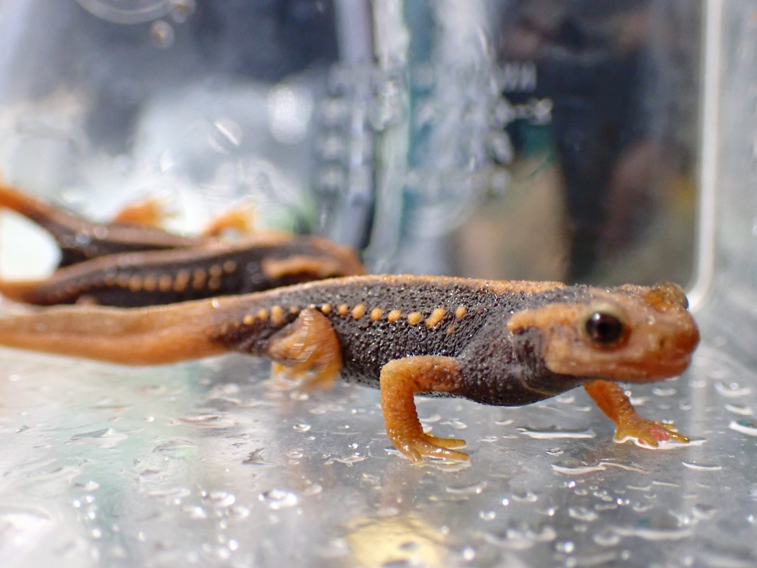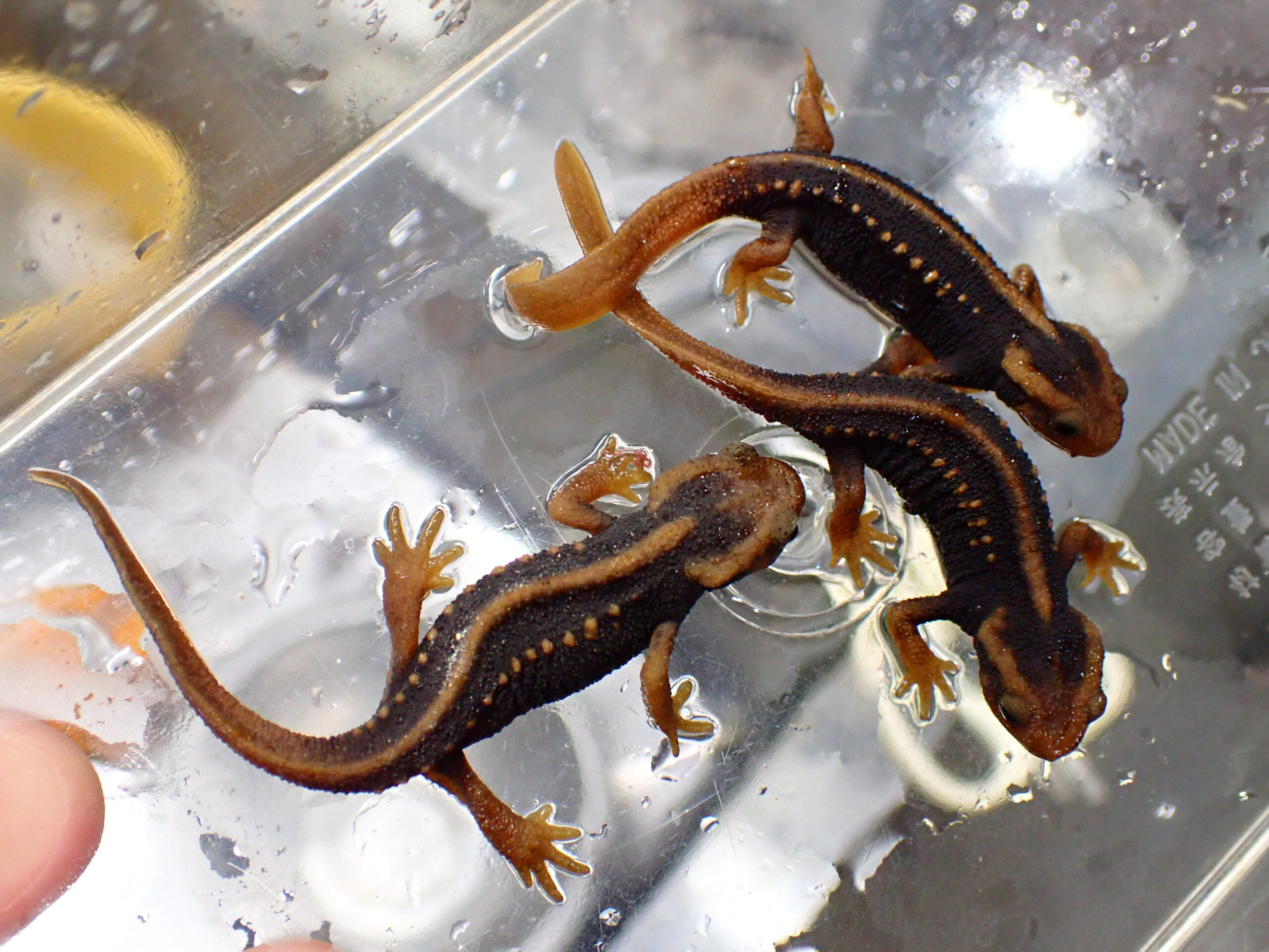 かわいいサイズのミナミイボイモリです。小さいうちは不鮮明な色ですが成長すると鮮やかなオレンジと黒の派手なイモリになります。今はまだ小さいコオロギとピンセットから赤虫やイトメを与えていますが、ふやかしたレプトミンとか人工飼料にも餌付きます。涼しい方がいいので今からの時期は飼いやすいですね!