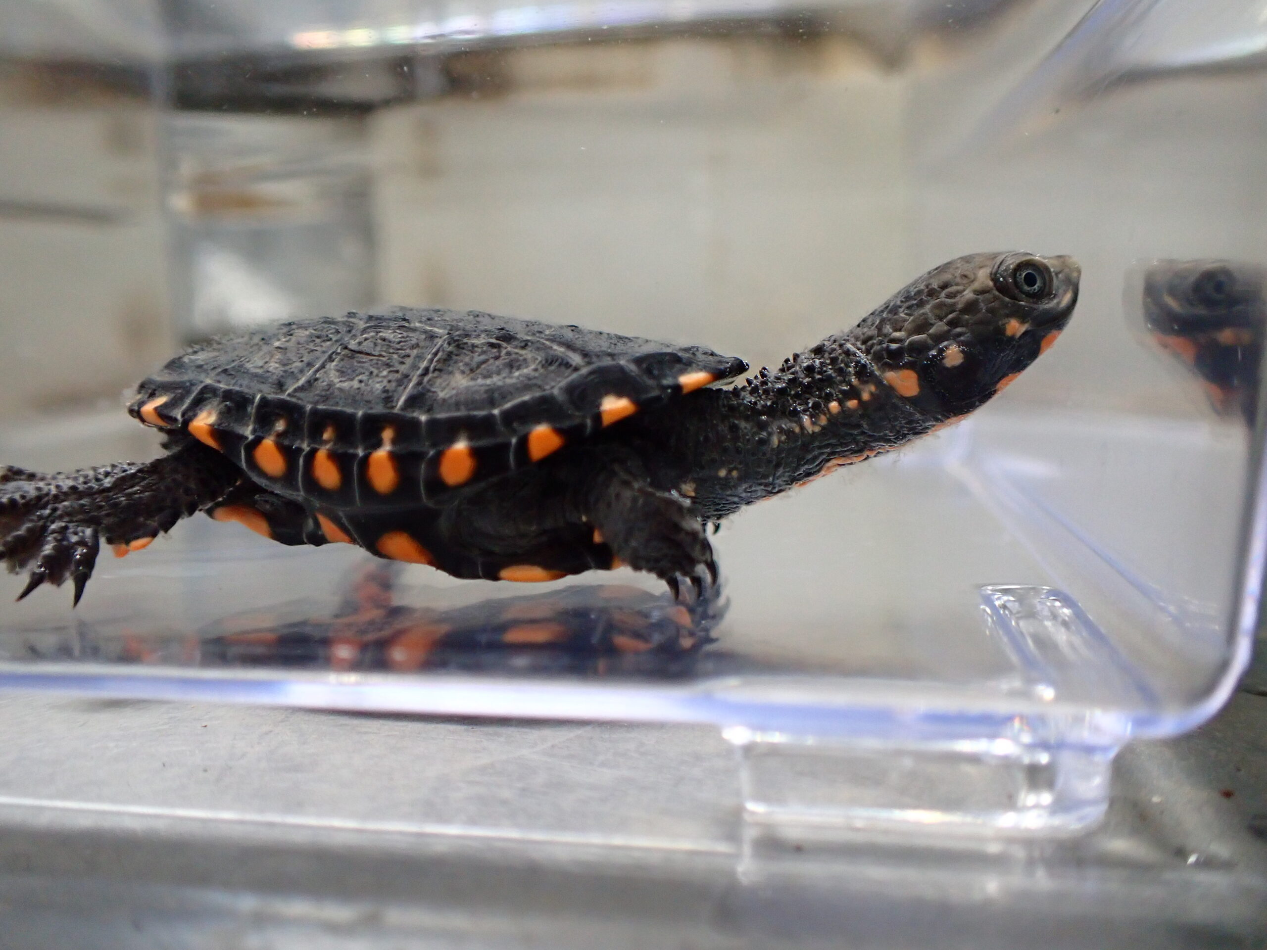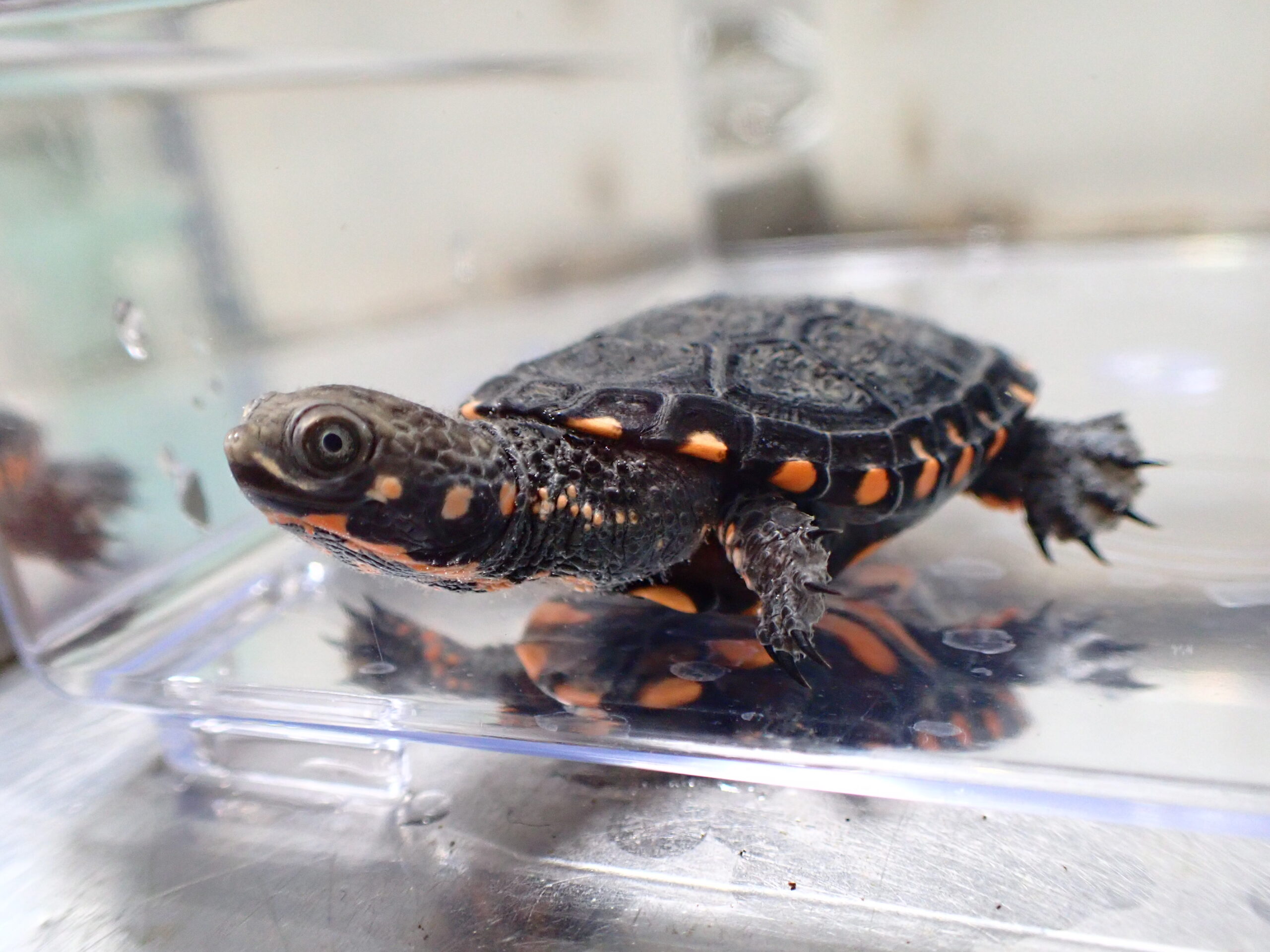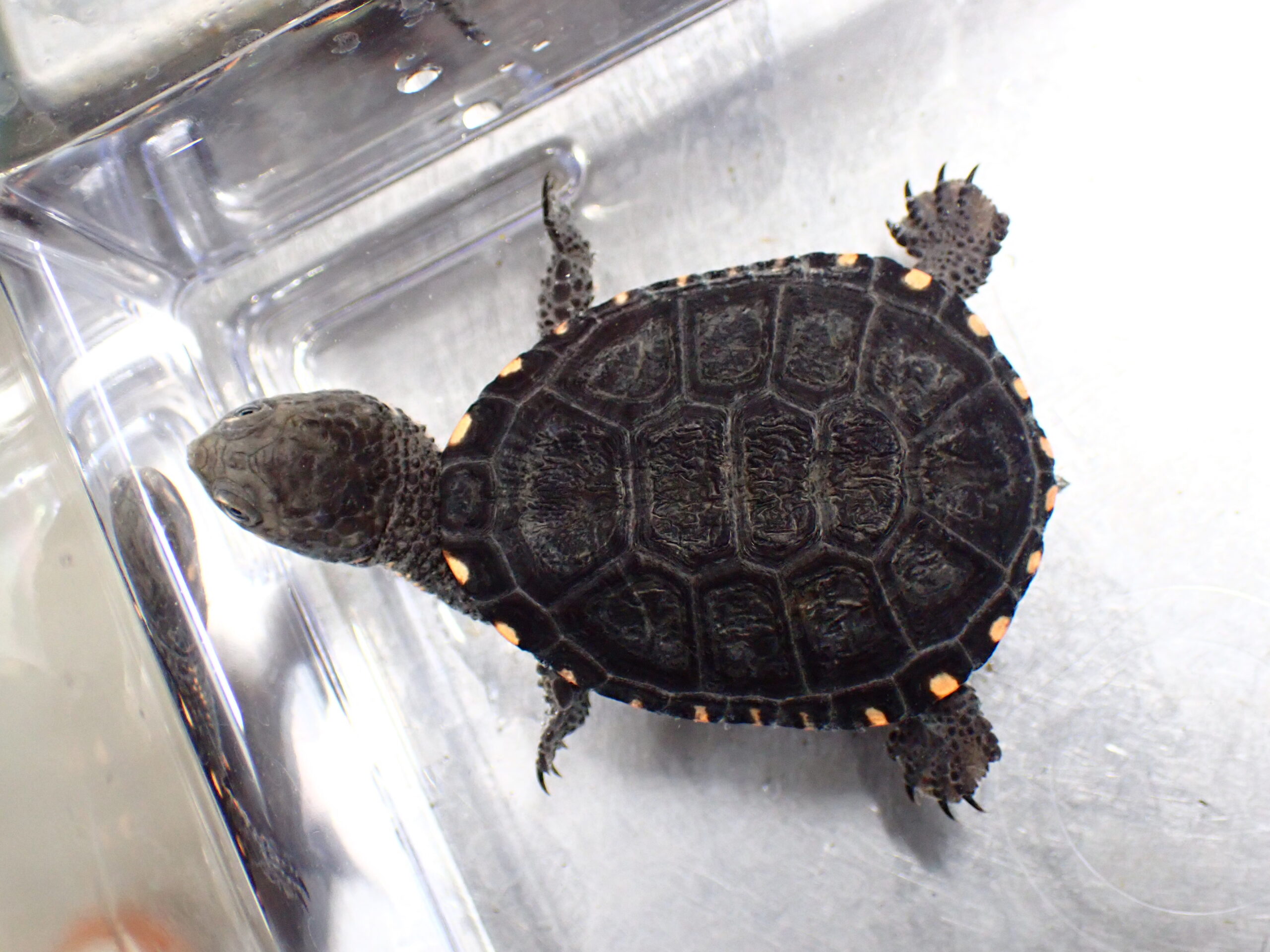超久々の入荷です!まだお腹が赤いかわいいベビーですが、成長は早いのですぐに大きくなりますよ。お腹の赤もあっという間に消えて黒くなってしまいますのでぜひ今のかわいいうちから育ててみてください!甲ズレなどの無い完品で餌も人工飼料をよく食べています。成長につれて首の棘条の突起が目立つようになりすごくかっこいいカメになります。個人的にも大好きなカメなので超オススメです!