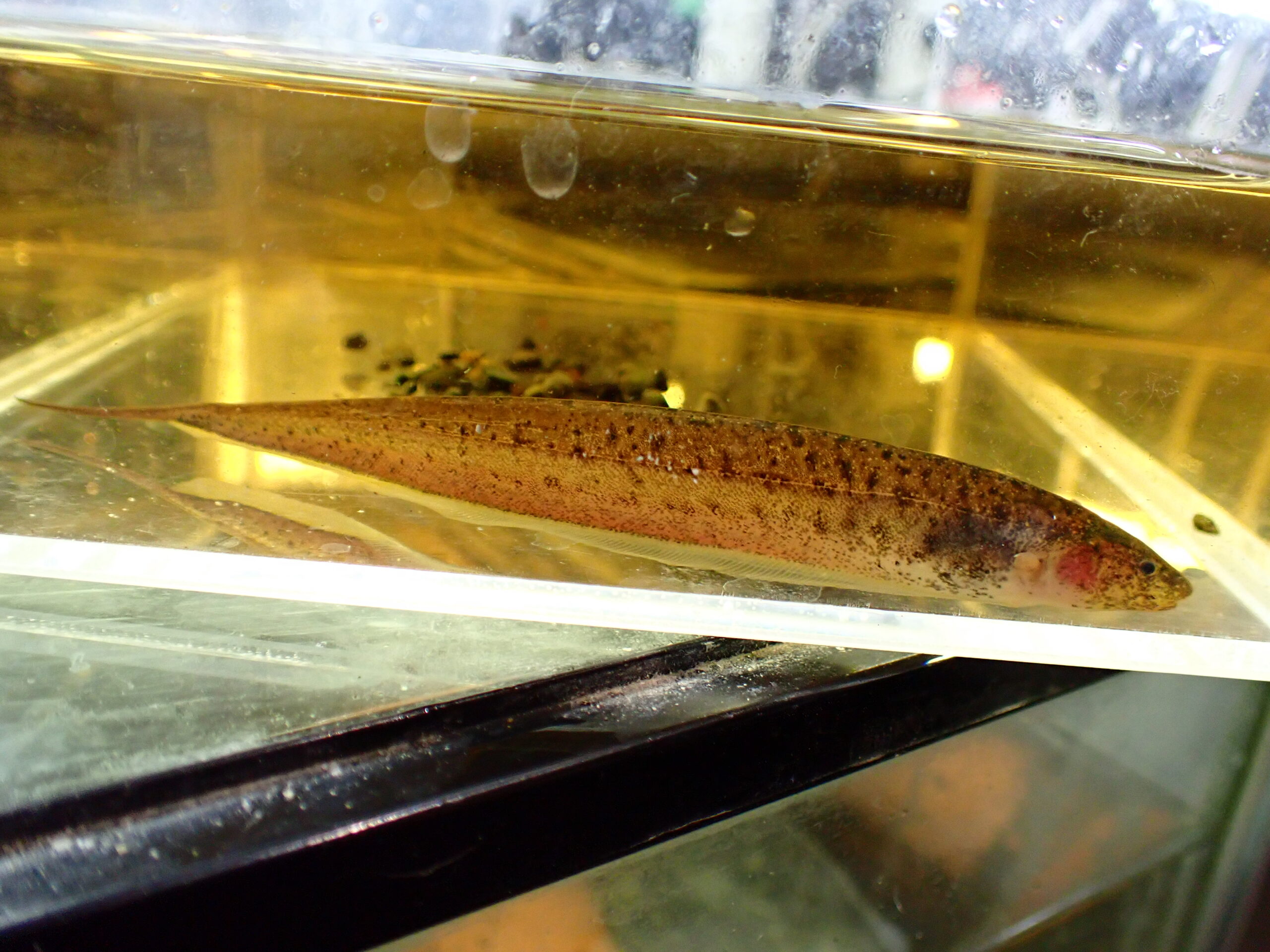 謎の南米ナイフ入荷です!問屋さんからは初入荷ではないかとのことですが、同属の他種は過去にも来たことありますが、この属のナイフは砂に潜る性質があるためサンドナイフナイフと呼ばれることもあるんだとか。どの種類でもこの仲間は滅多に見られな珍しいナイフなのは間違いないです。過去に来たことのある種類はもっと丸顔でしたが今回のはブラウンゴーストのような面長な顔をしていてちょっとかっこいいです。まぁ昼間は砂に潜ってるのでそのかっこいい顔もなかなか見られないんですけどね。そんな激レアなサンドナイフの仲間が少数輸入されたと聞いてすぐに仕入れておきました!珍しい割に値段もそんなに高くないのでマニアの方はお見逃しなく!複数匹入荷していますが、そんなにたくさんはいませんのでお早めに!