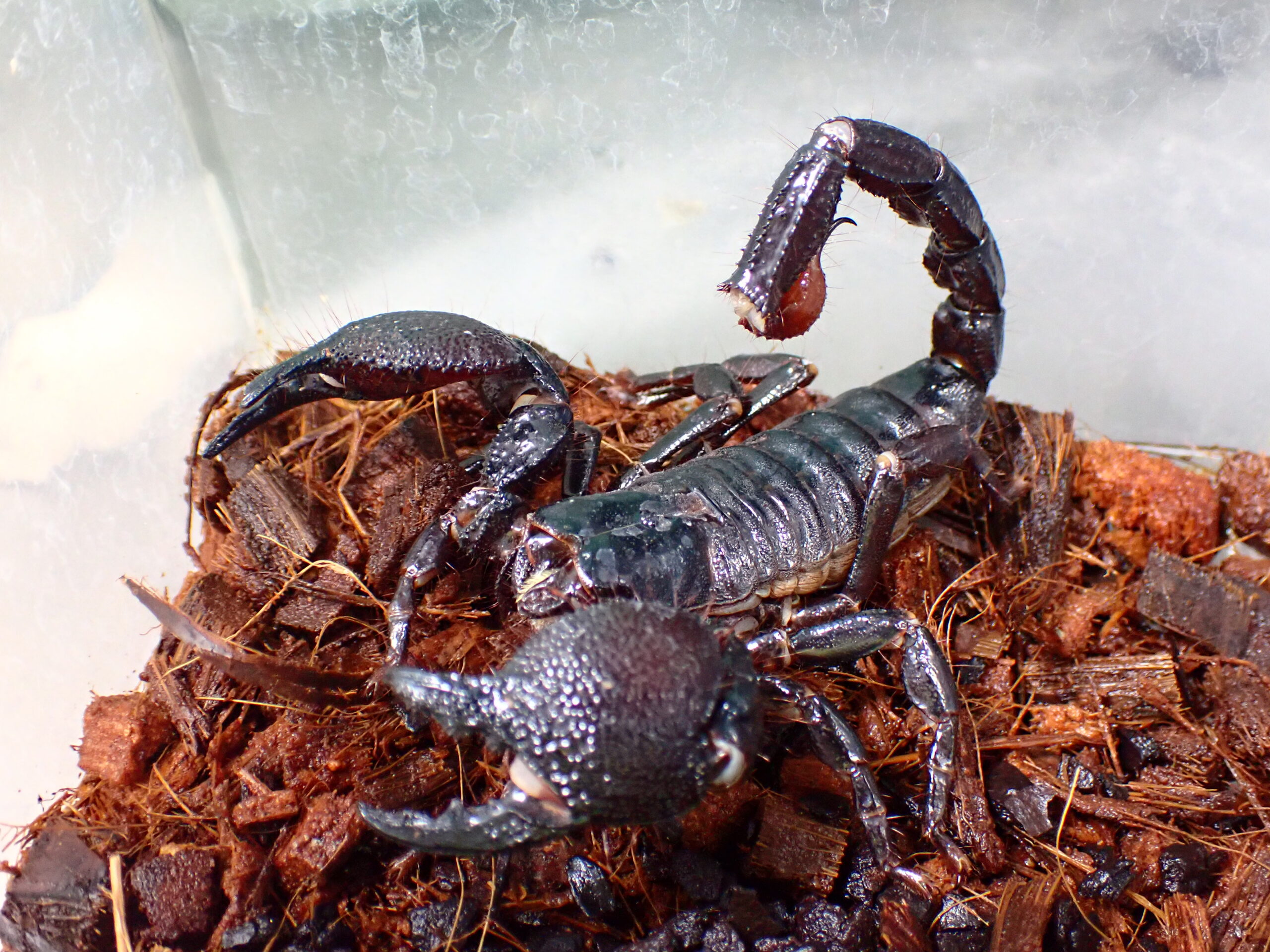 鋏脚や尾を入れたら12~13cm位はあると思います。ごつくてすごくかっこいいです。毒はあまり強くありませんが刺されないように取り扱いには注意してくださいね。とても丈夫な種類ですが水切れには弱いので乾燥させないように注意しましょう。画像の個体の販売です。