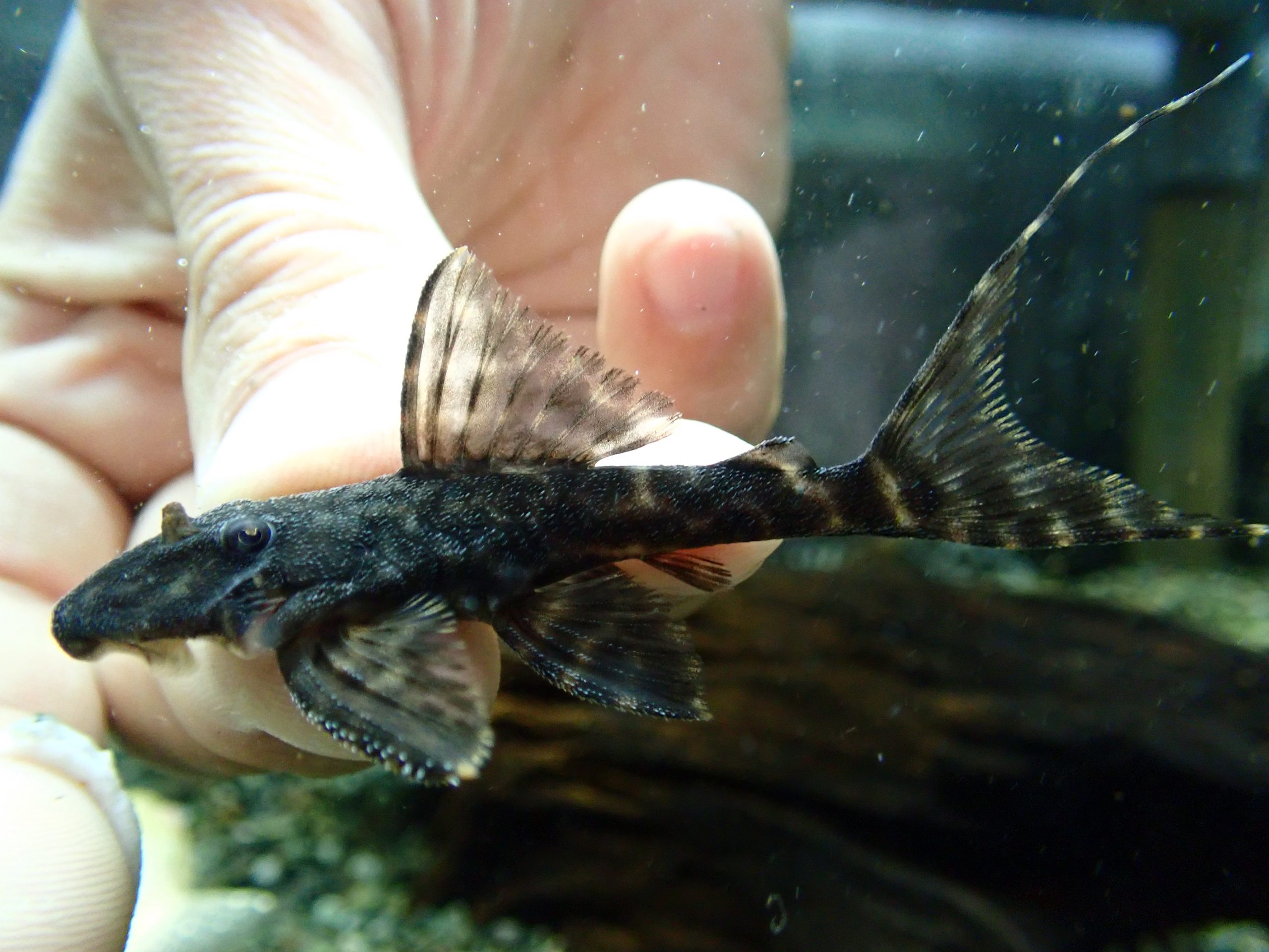 名前にアカリエスピーニョとありますが全然トリムプレコの仲間とかじゃありません。でもアカリエスピーニョのように尾ビレの上下がフィラメント上に伸長しシルエットのとてもキレイなプレコになります。