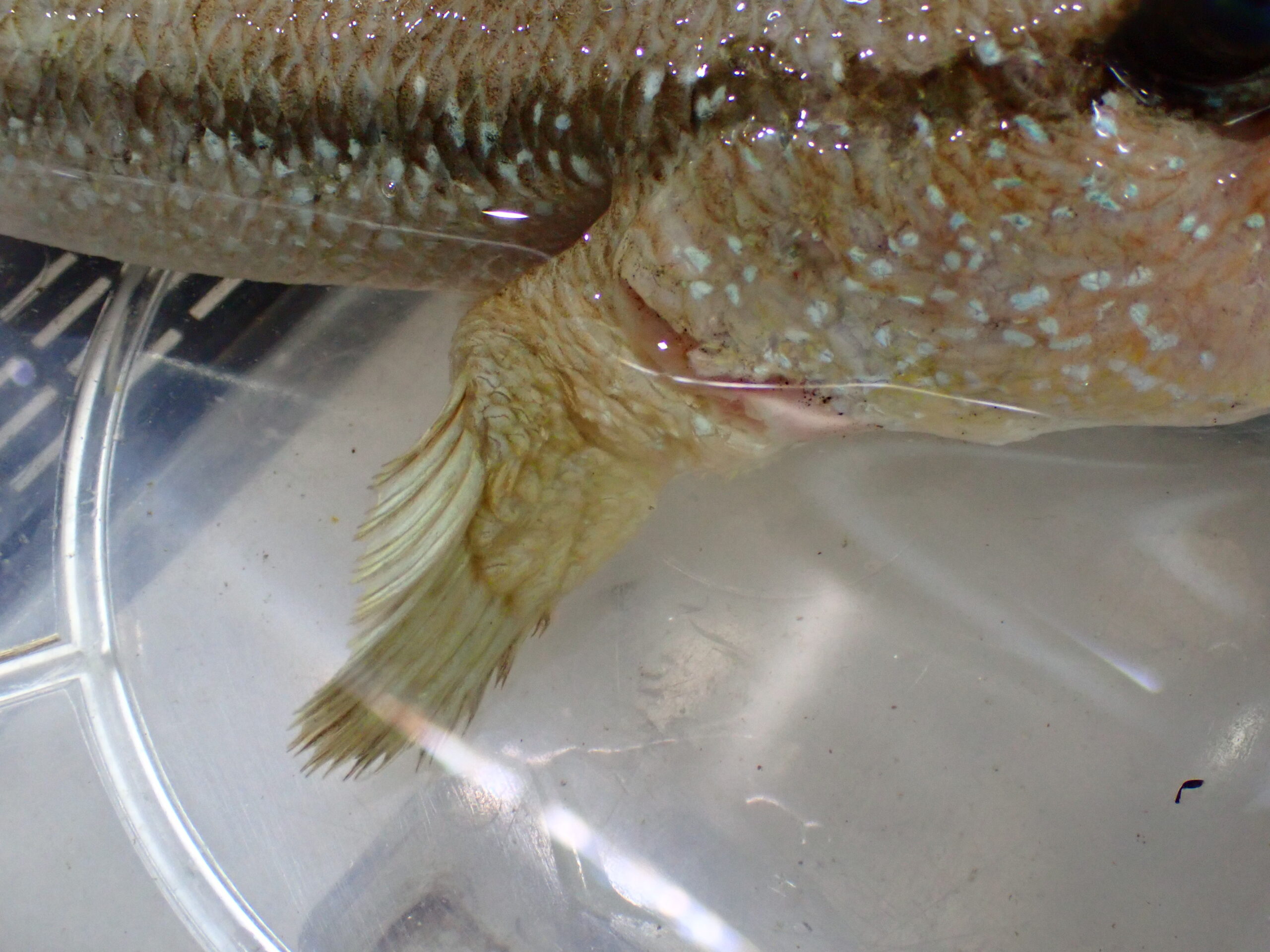 片方の胸ビレが少し小さくて、その付け根付近に擦りむいたようなスレがあります。ヒレはちょっと付け根の部分から細くなってる感じもするのでキレイにはならないかも・・・。でもスレの方は飼っていれば治ると思います。魚自体は元気なので多少の欠点は気にしないという方にはお買い得ですよね!?