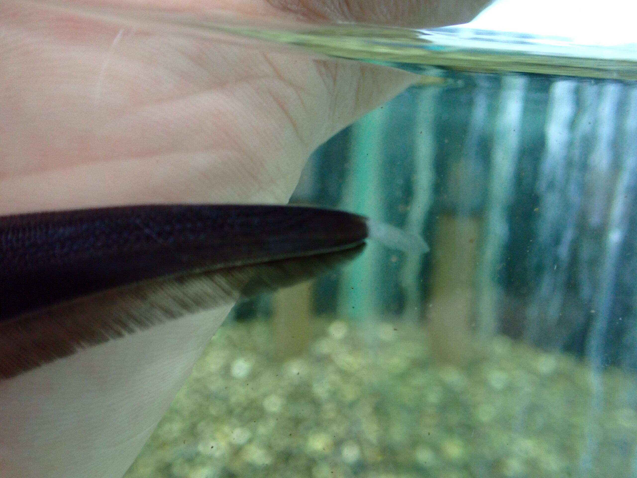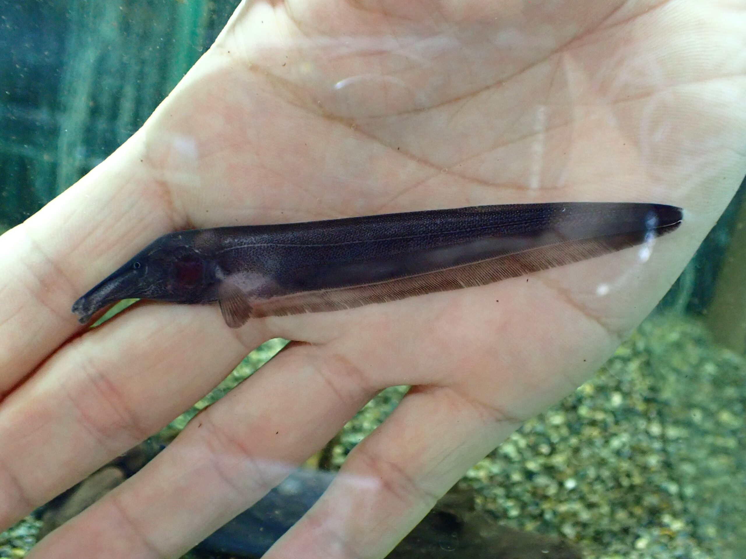 長い吻が特徴の南米ナイフ。いつももっと大きいサイズでくるから値段ももっと高いんですが、今回は小さめサイズできたので大特価です!1匹のみ!画像だと分かりにくいですがちゃんと尾ビレあります。たぶん1度誰かにかじられて再生したばかりだから白くて見えにくいんだと思います。