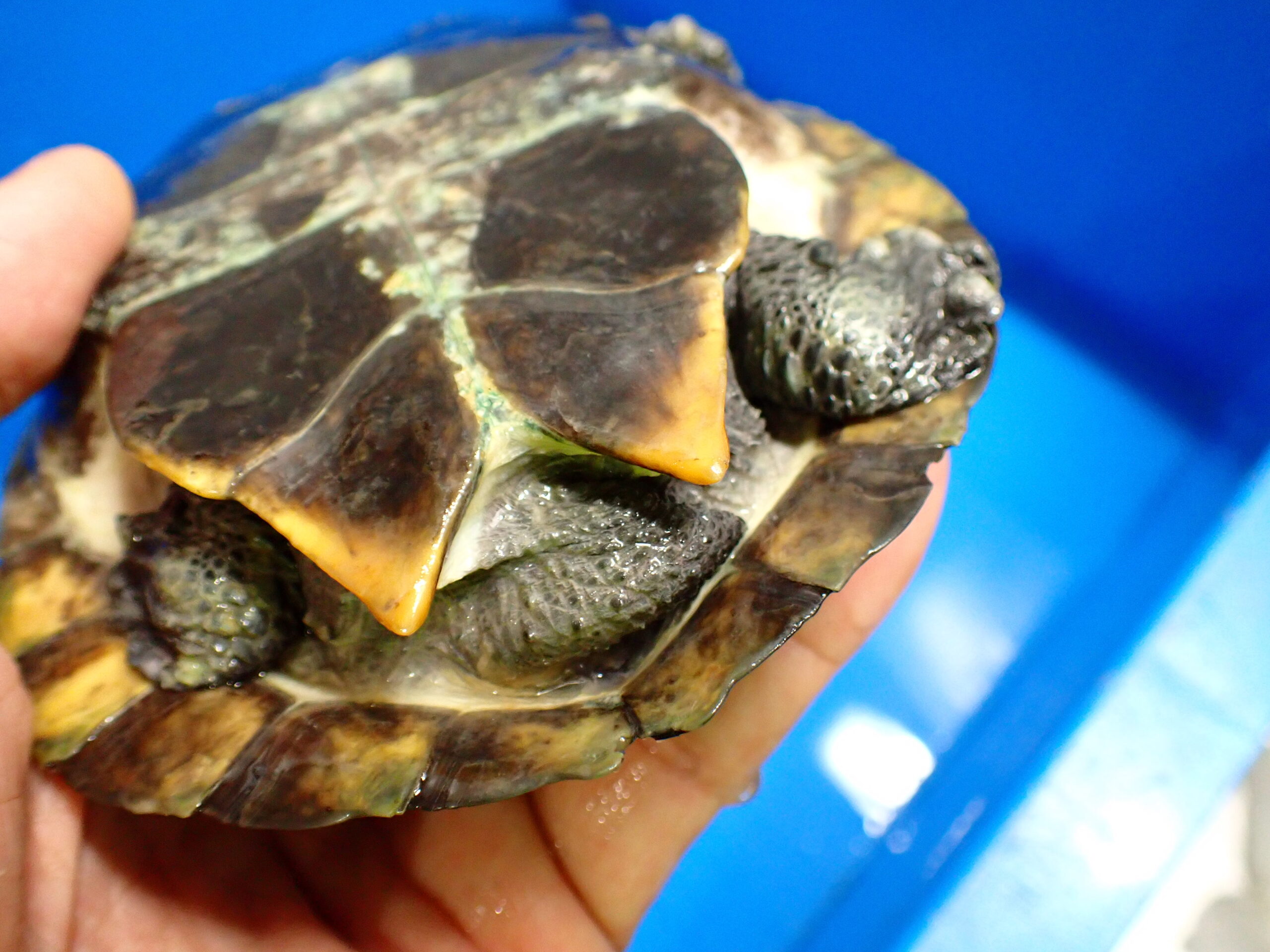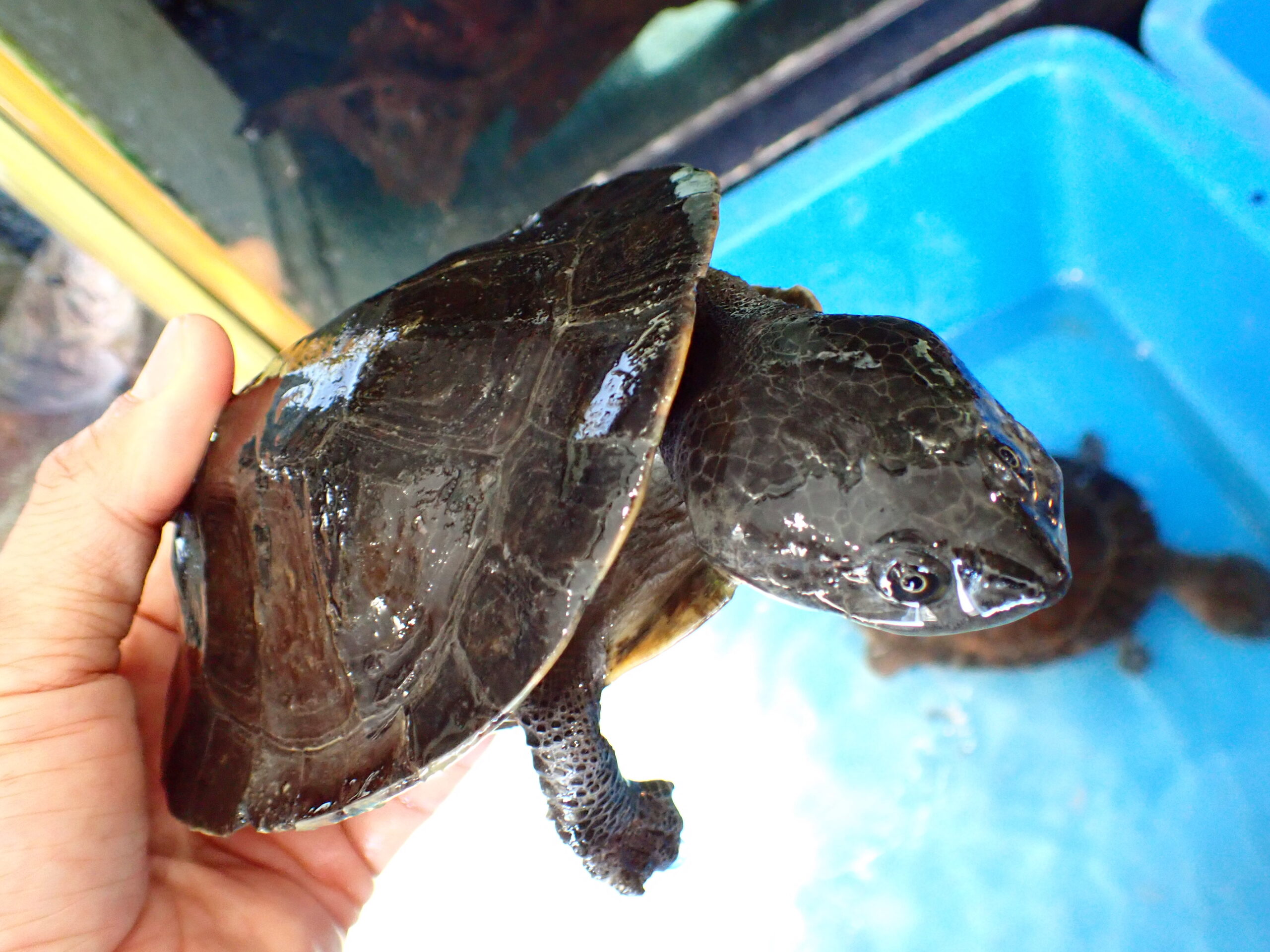 ワイルドにつき多少の甲欠けやスレなどはご了承ください。爪折れはありますがどれも元はあるのでそのうちに再生すると思います。餌は人工飼料に餌付いていますので安心です。頭でっかちのかわいいカメで泳ぎの上手いので広い水槽で泳がせて飼うと見ていて楽しいです。大型魚との混泳水槽での飼育もオスメスですよ!雌雄判別は絶対というお約束はできませんがご了承ください。オスメス1匹ずつのペアで入荷していますのでぜひペアで繁殖狙ってください!ペアの場合はペア特価出しますのでお問い合わせください。