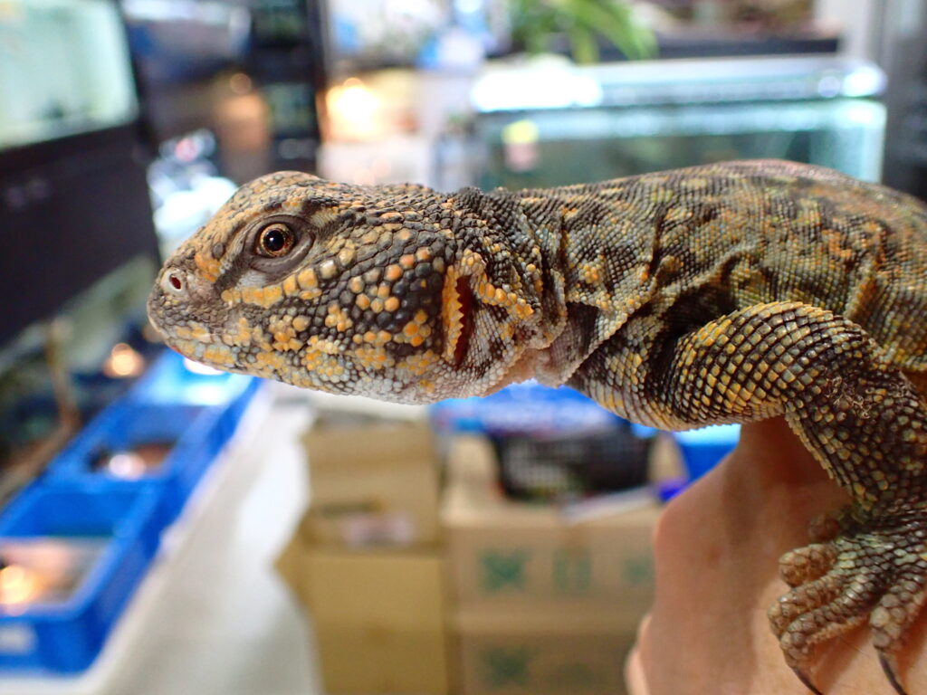 全長で30cm弱の個体です。最大で全長40cm程になる種類なのでこれでもまだヤングサイズ。なのでしっかり飼い込んで仕上げてあげれば発色もまだまだこれから。グリーン系のタイプになると思いますが、頭は赤く発色していて体は一部青っぽかったり赤っぽかったりなので仕上がったら派手な個体になりそうです。ワイルドですが尾切れや爪欠けなどのない完品で、状態も良好で餌もよく食べています。トゲオアガマの中でも特に丈夫で飼いやすい種類なので初めてトゲオアガマ飼育にもオススメです!