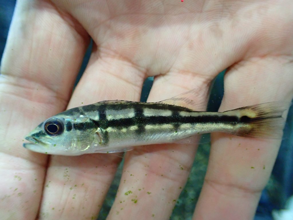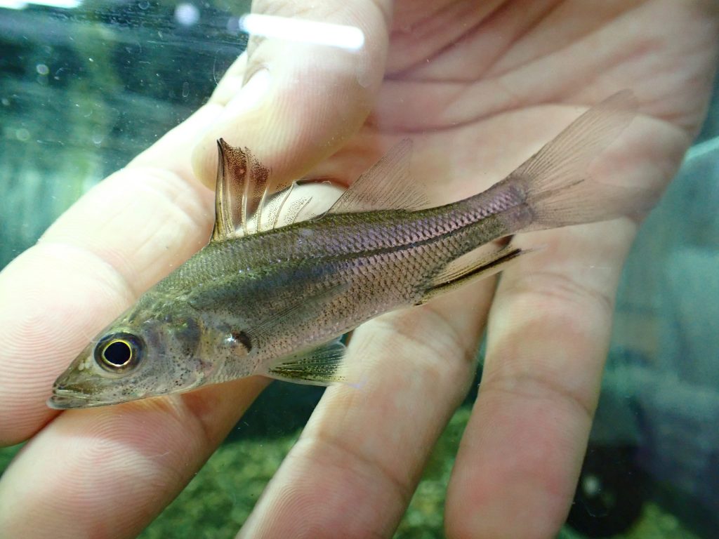 スリナム産のスパインソードスヌーク。成長すると普通のスヌークよりも体高がでてかっこいいです。純淡水で飼育できますが、pHの低い古い水は苦手ですのでややpH高めの新しめの水で飼育してあげてください。