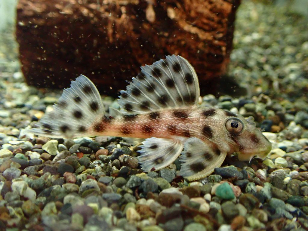 ずんぐりした体型とスポット模様が特徴のスリナム産のレアプレコ。たまに大きいサイズが輸入されることもありますが、大きいのは超高いので小さいのから育ててください。まぁ小さいのでも結構高いんですけど・・・。