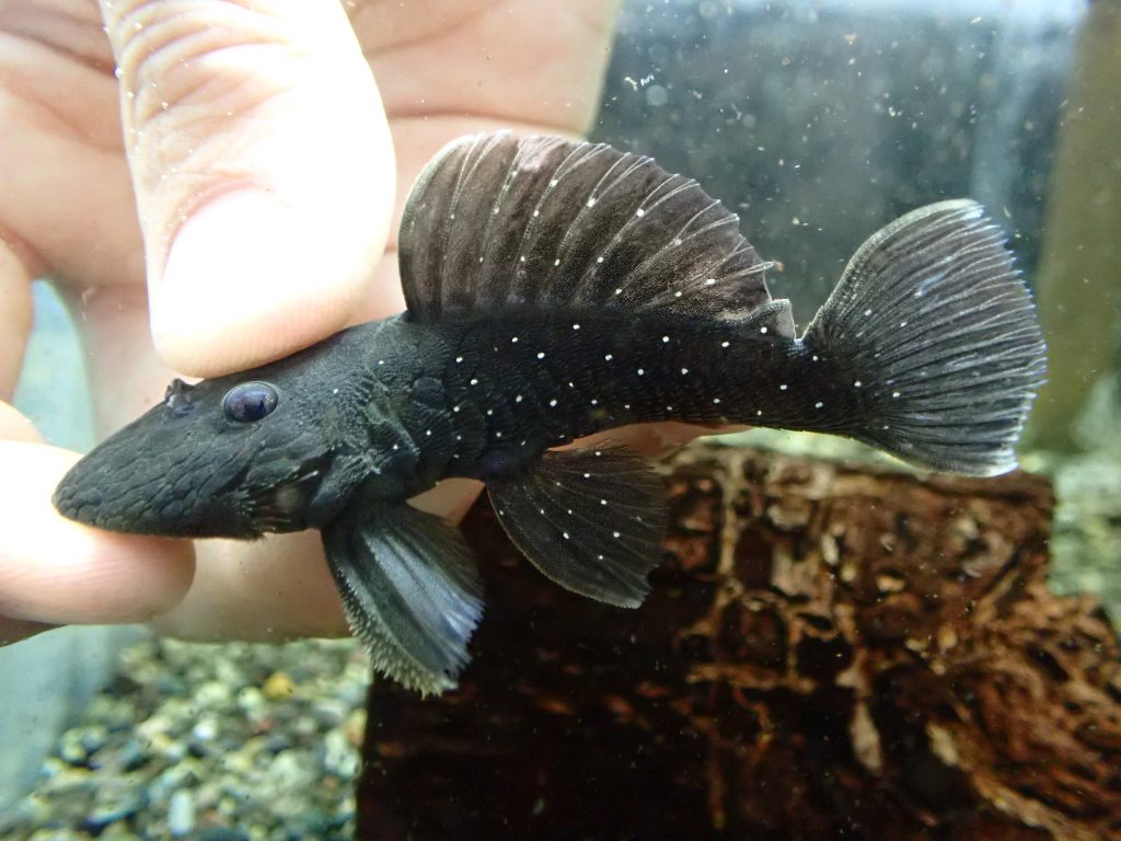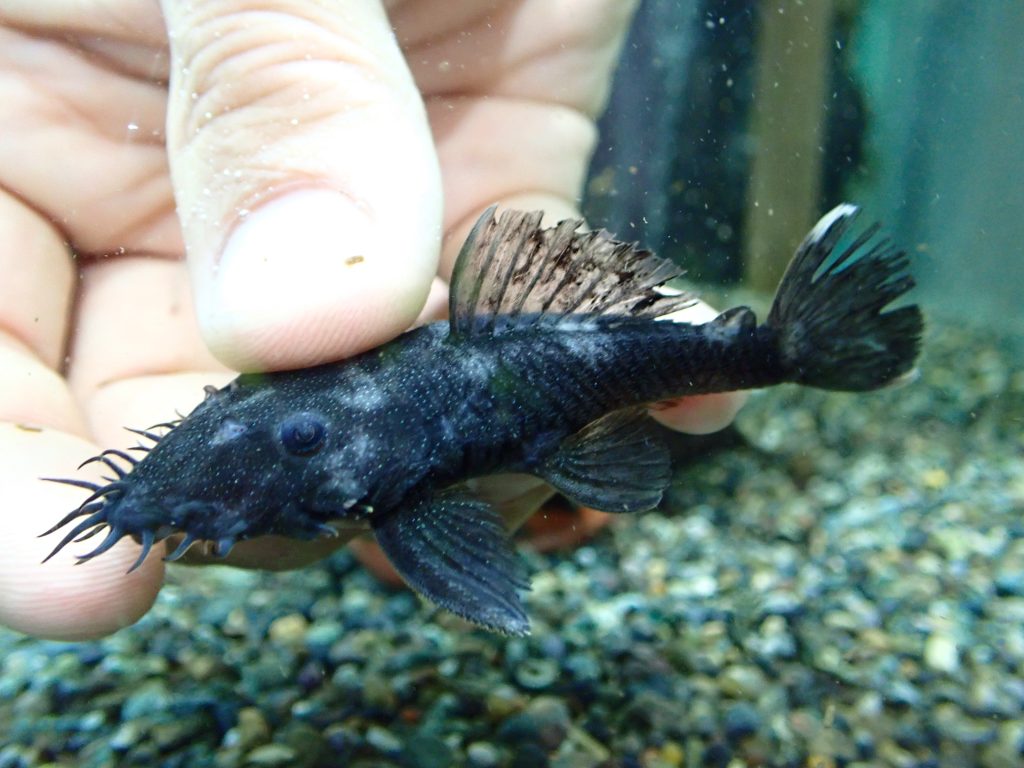 スターライトグローボに混じって輸入されました。名前の通り模様が無くて真っ黒ですが、よく見ると少しオリーブがかったような感じの黒です。スターライトグローボよりもややロングスナウト気味です。これも1匹のみです。混じりでの入荷なので問屋さんにももういません。マニアックなプレコがお好きな方には特にオススメです!