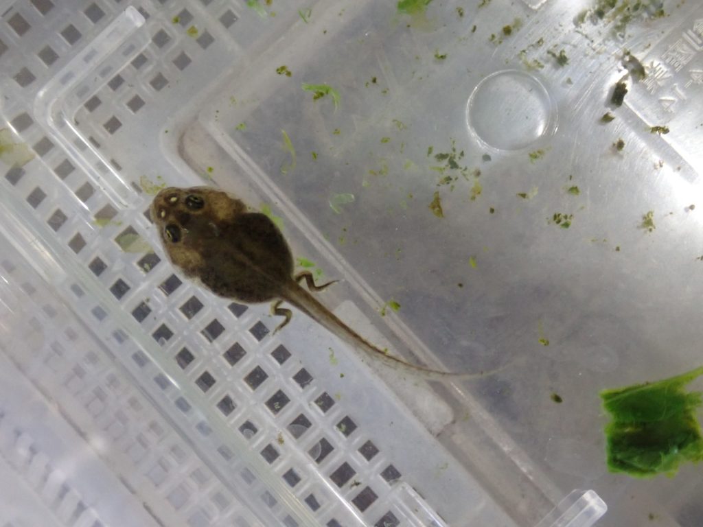 後ろ足が生えてる大きめオタマ。くたくたになるまで茹でたほうれん草をよく食べています。カエルになったら値段上げさせていただきますので悪しからず・・・。
