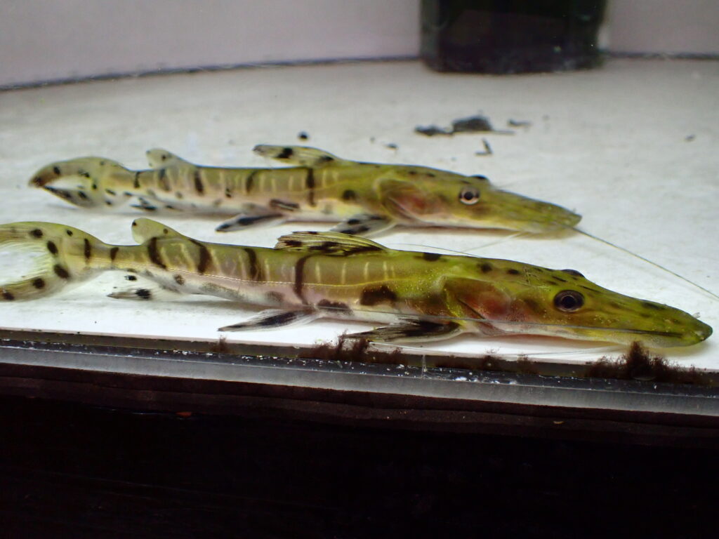 2ペア入荷したんですが、メスが1匹背ビレに難有りなのでとりあえずオス単かペア売りです。オスは12cmでメスは10cm位です。オスはもうヒゲボーボーになってきてますよ!