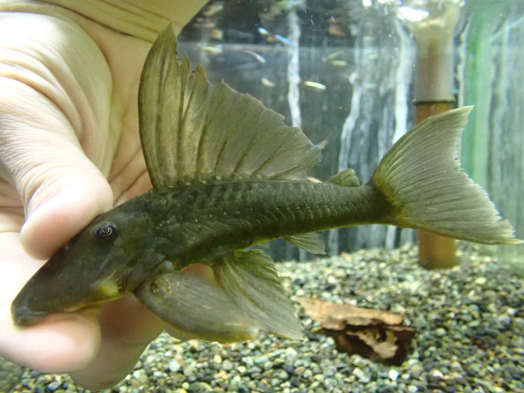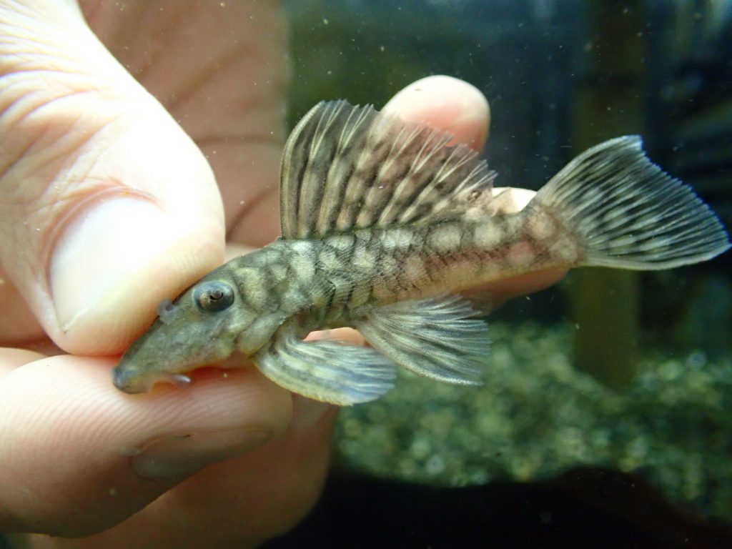 大きなスポット模様が特徴のずんぐりしたかわいいプレコ。うちの店ではあまり人気無いですが、個人的には結構好きです。よく見るとかわいいんです。
