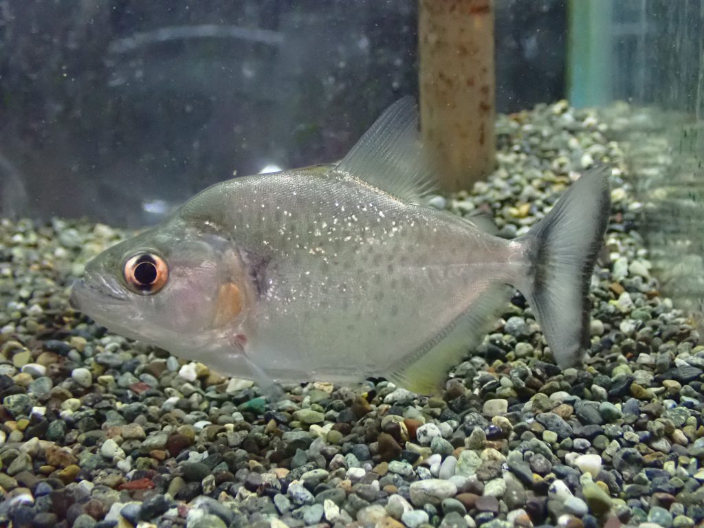 シングー産のバイオレットブラックです。真っ赤な目とダイヤモンドブラックみたいに鱗のラメが強く白っぽくてギラギラした体色がキレイなピラニア。成長すると名前の通り紫がかった光沢が強く発色する個体も多く、黒いシミのような模様が出てくることもあります。バイオレットブラックじゃない普通のシングー産ブラックも在庫います。お近くの方はぜひ店頭で見比べてみてください。
