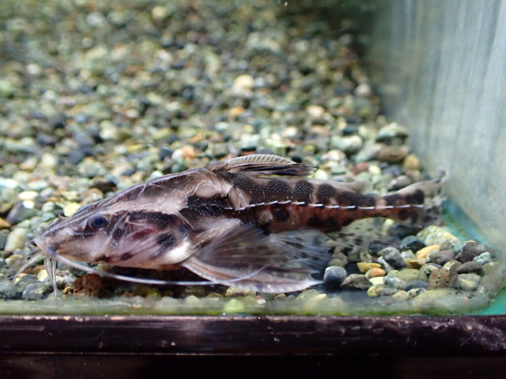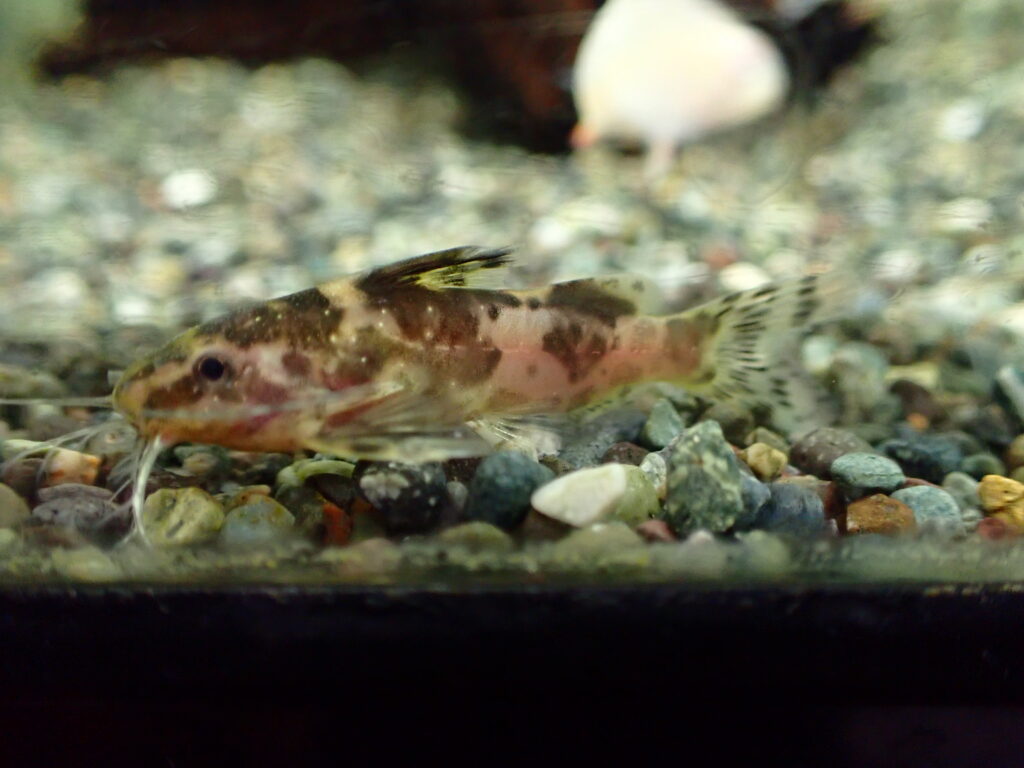 ギニア産のころころしたかわいい小型ナマズです。黄色とこげ茶色のまだら模様がキレイです。