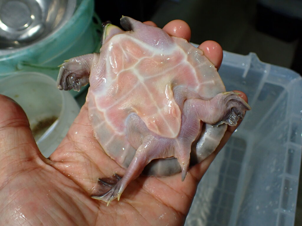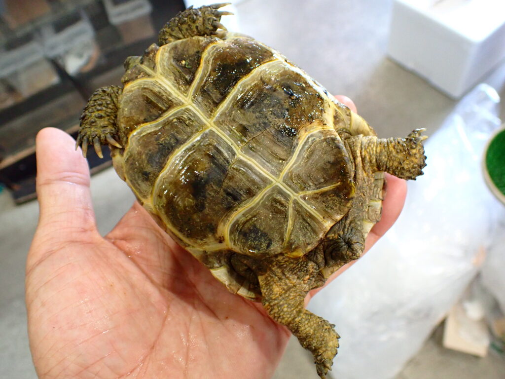 2週間前に入荷してトリートメントしていた個体です。入荷した時は少し甲羅や肌が荒れていましたがいまではキレイになり餌も人工飼料をバクバク食べています。基本的には丈夫なカメですが輸入直後のベビーは結構デリケートなので買うならしっかりトリートメントしてある状態の落ち着いた個体がいいですよ!あと甲長13cm位の大きめも在庫います。大きい分少し値段は上がりますが、大きいの欲しい方はそちらをどうぞ!