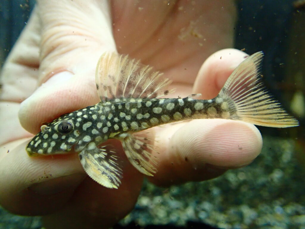 先日特大サイズが入荷しましたが今回は小さいの来ました。小さいと言っても11cmありますからかなりしっかりしています。真っ黒の体に細かいホワイトスポットがとてもキレイなトリムプレコです。