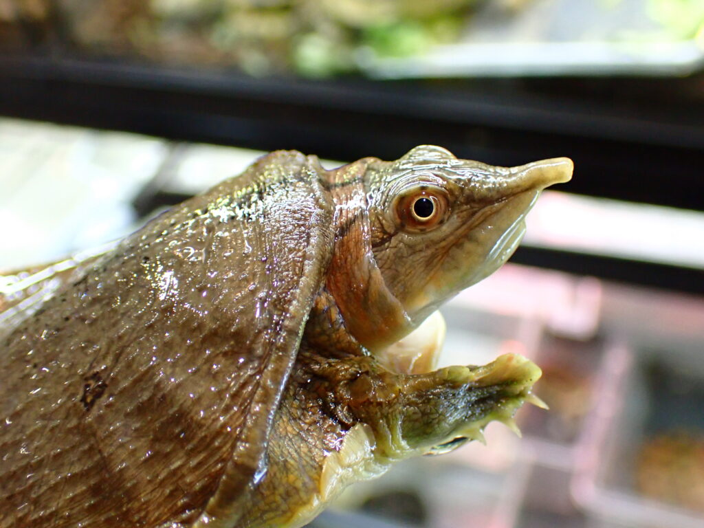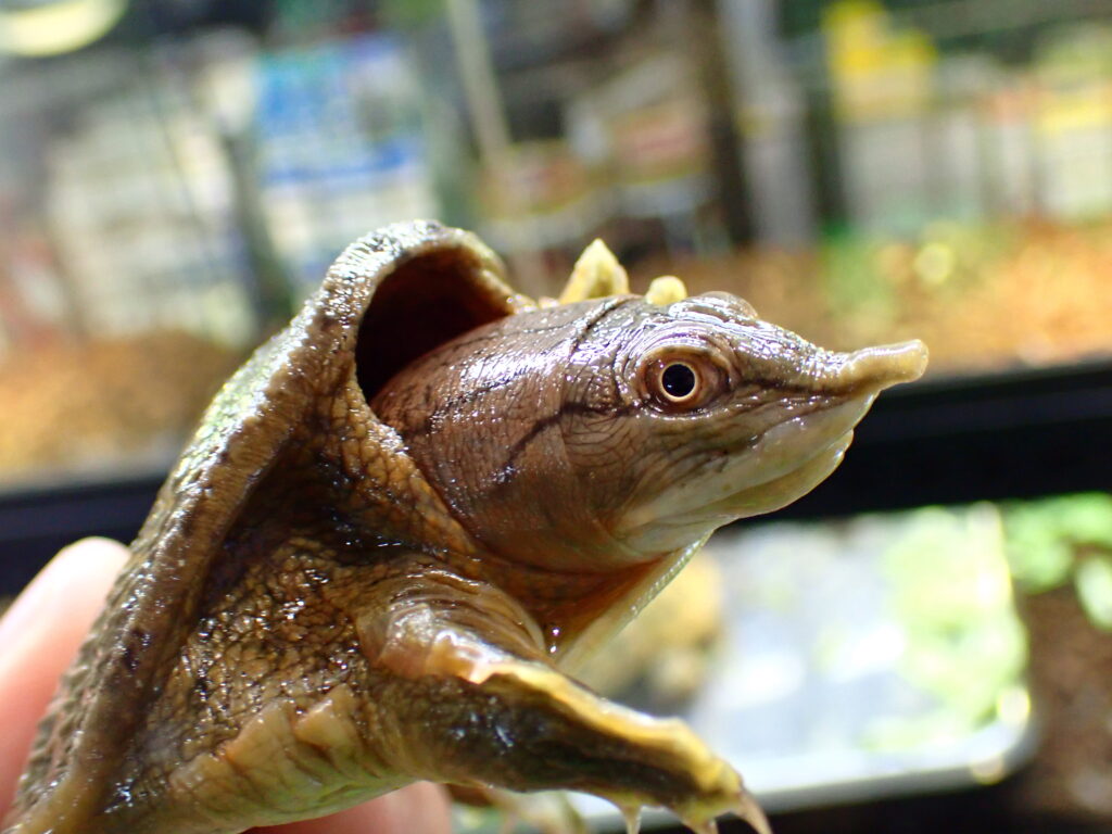 入荷してからしばらく様子を見ていましたが、状態はとても良いです。大きな頭が特徴で、ヒラタスッポンの小さい個体はとてもかわいいですね!巨頭系のカメがお好きな方はぜひ!甲欠けなどもありませんし、頭や首が赤く発色しているとてもキレイな個体が入荷しています。マズリの水ガメフードは口に入れて砕いてはいましたがまだちゃんと食べてはいないようです。でも乾燥川エビはバクバク食べていますので生き餌じゃなくても大丈夫です。カメプロスプレミアムとかレプトミンスーパーならすんなり食べてくれるかもしれませんね!?最近ではあまり輸入されず滅多に入荷しないスッポンなので気になる方はお早めに!上の2つ、下の2つの画像がそれぞれ同一個体です。
