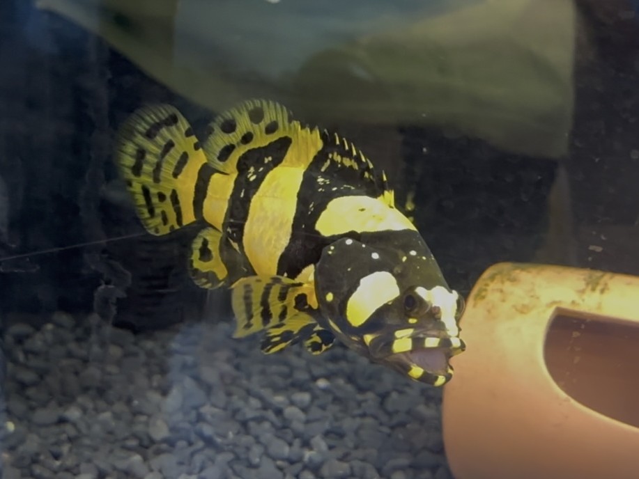 ホームページ載せる前に売れてしまいましたが、せっかくなので画像載せます。黄色い発色のとてもキレイな個体です。現在塩分濃度0,2%ほどの汽水でストックしていますが状態は良好で人工飼料にも餌付いています。終生飼育が可能かは分かりませんが、インドネシア産のバンブルビーグルーパーは淡水や薄い汽水で状態良く飼育ができます。台湾ブリードのジャイアントグルーパーを薄い汽水に慣らして飼育している例もあるようですが、台湾産のは海水じゃないと厳しいイメージ。汽水だとちょっとしたことで状態を崩したりで、自分にはインドネシア産のような感覚では飼えなかったです・・・。どなたか台湾産のを薄い汽水とか淡水で上手に飼えている方がいたらコツを教えて欲しいです・・・。