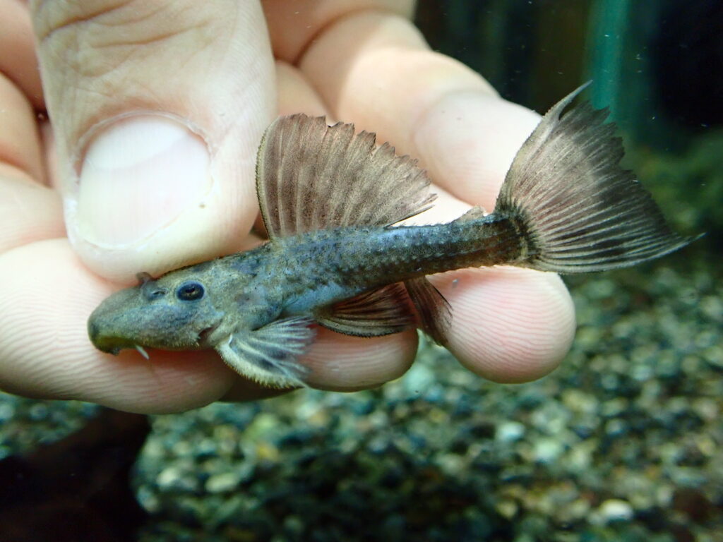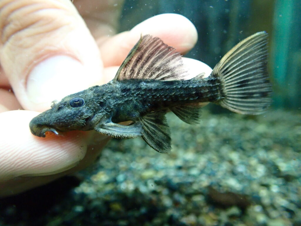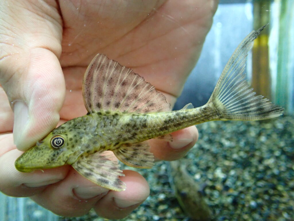 黄色っぽい黄土色っぽい地色に細かいスポットが入るプレコ。ペルーレッドパナクェに混じってくることが多いプレコです。高いプレコじゃないですがなかなかかっこいいですし、これ系のプレコはコケもよく食べてくれるのでオススメです!