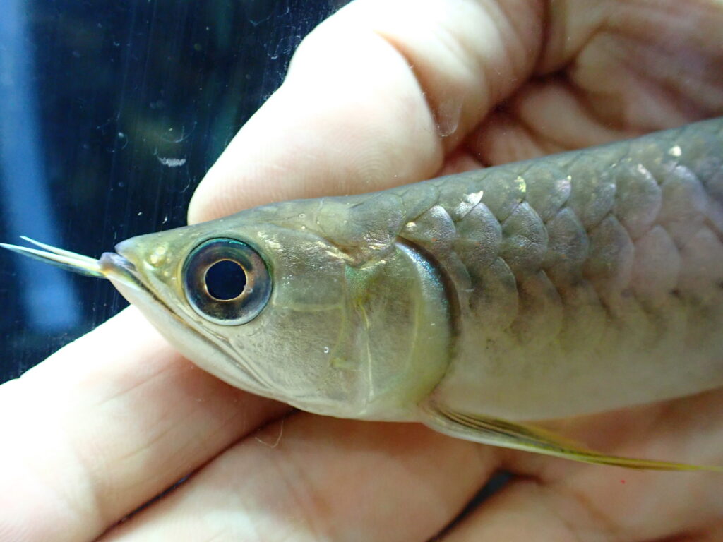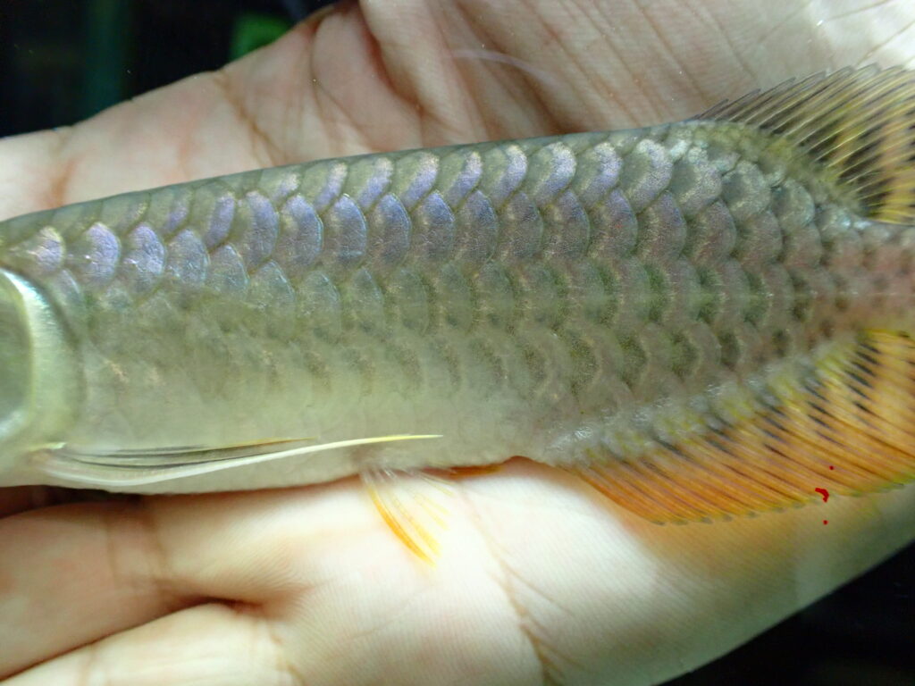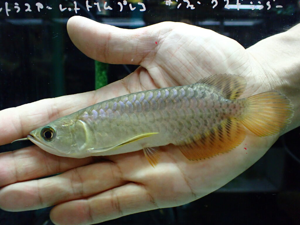 ドリームフィッシュファーム産のハイクオリティ過背金龍です。多数の中から特に青くなりそうな個体をセレクトしてきました。画像だと分かりにくいですが鱗は青い光沢で覆われていて将来有望な個体です!藍底過背金をお探しの方、この個体オススメです!2枚目の画像で黒目の縁に白く映っているものがありますが、ガラスの汚れです。実際には目に白い点や傷などはありません。