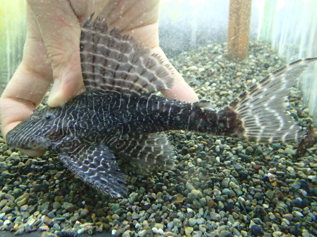 長く伸びた白い尾ビレのフィラメントが特徴のプレコ。これも名前にアカリエスピーニョとありますが、Pseudacanthicus属ではなくPanaque属の1種。最近ではあまり入荷がない珍しいプレコで、とてもかっこいいです!このサイズでこの値段はお買い得ですよ!