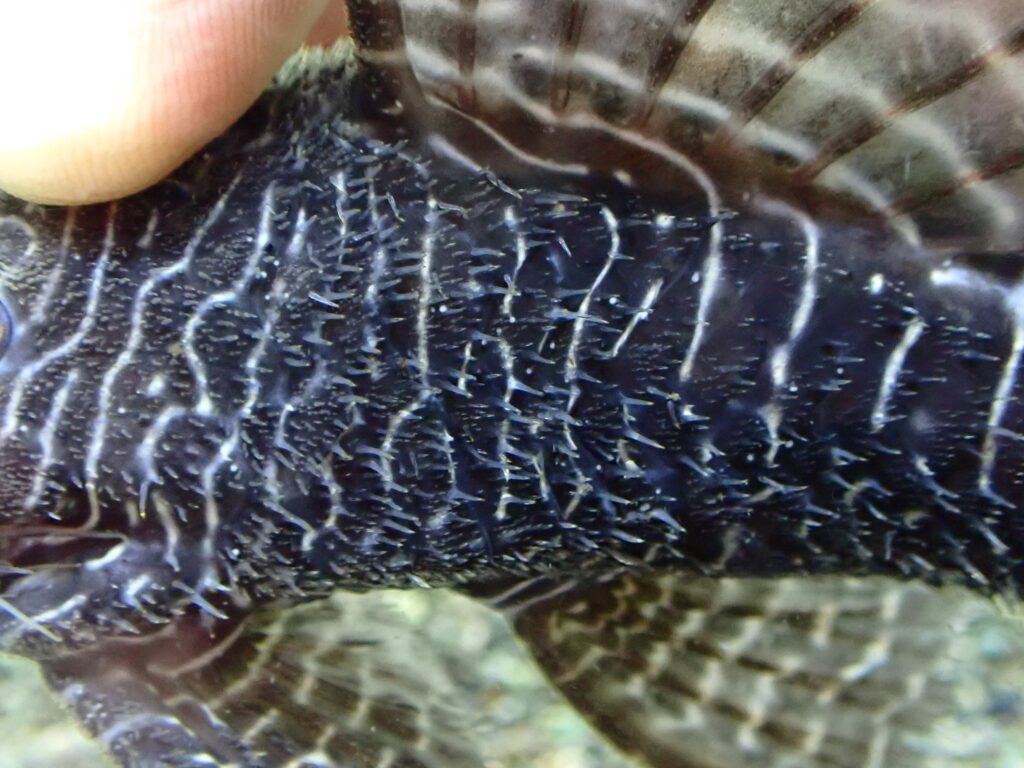 クイーンアラベスクのような細かい白いラインが特徴の全身トゲトゲなプレコ。名前にアカリエスピーニョとありますがPseudacanthicus属ではなくPanaqolus属の1種。今回久し振りに入荷しましたが、全身針のような棘がびっしりと生えた超厳ついオスと思われる個体が来てます。メスも棘は生えますがその発達具合はオスに比べると全然なので、繁殖狙うとかじゃなくて1匹だけ飼うなら絶対にオスがオススメです!