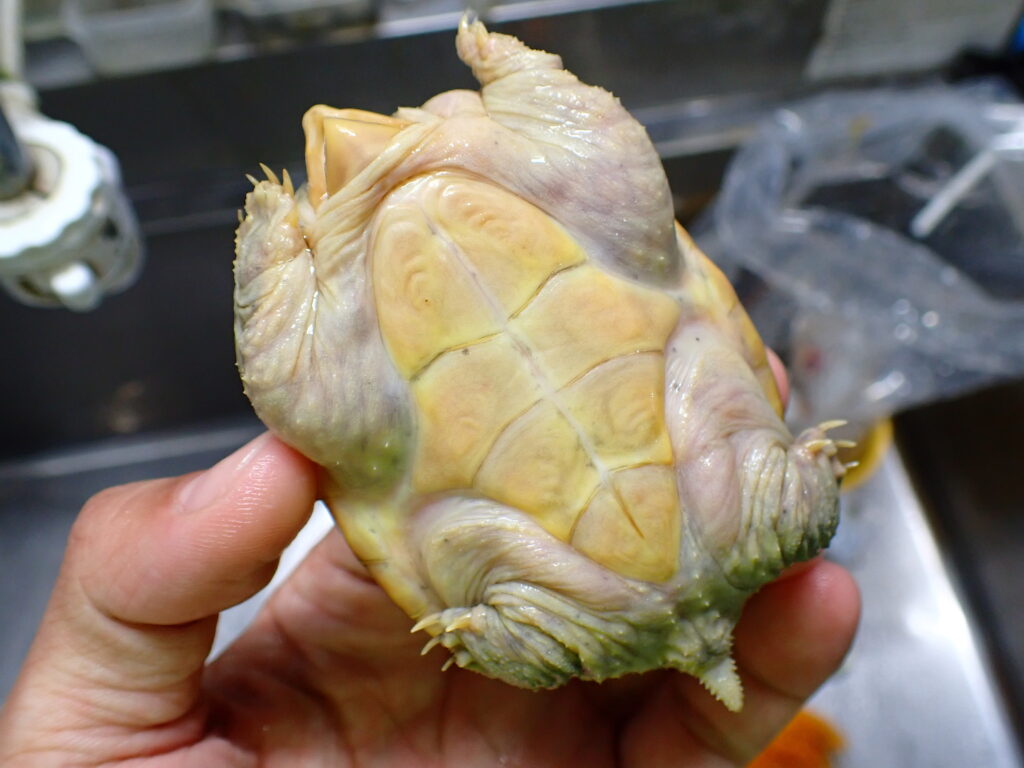 大きめで安心サイズな個体です。ハイポ系の体色の薄い個体で、甲羅は黄色っぽくて皮膚の色は白っぽいです。甲羅にはうっすら放射模様出てきていますので、成長したら黄色い甲羅に薄い放射模様の出たキレイな個体になりそうです。人工飼料バクバク食べて絶好調です。もちろん甲ズレや爪欠けなどもありません。