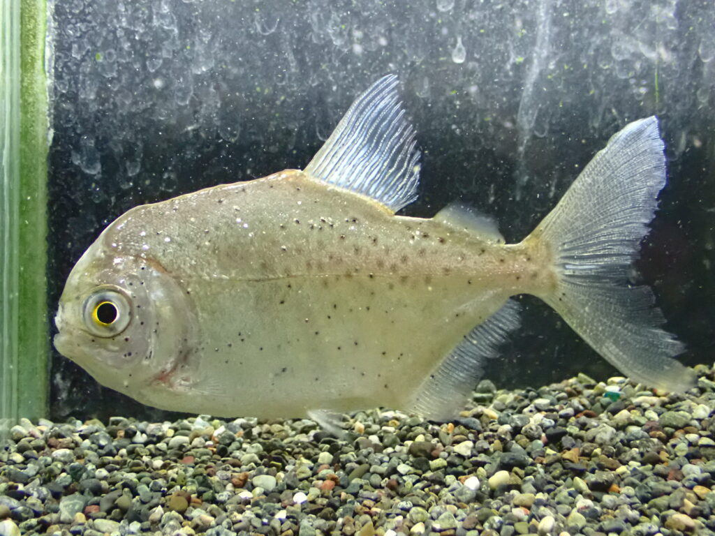 これは何でしょうか?すごく変なメチニス・・・。背中が平らな奇形?ハイブリッド?それともこういう魚でこれで正解なの??とにかく謎なメチニスで尾ビレかなりデカいです。1匹のみなので他の個体と比べようがなくてよく分かりませんが、面白い個体なのは間違いないです。顔回りがスレたような感じで白っぽくなってたり、胸ビレ、腹ビレの先に少々のヒレ欠けがあったりと少し気になるところもありますが初めて見る面白い魚です。1点物なレアメチニスの可能性大です!マニア必見!!