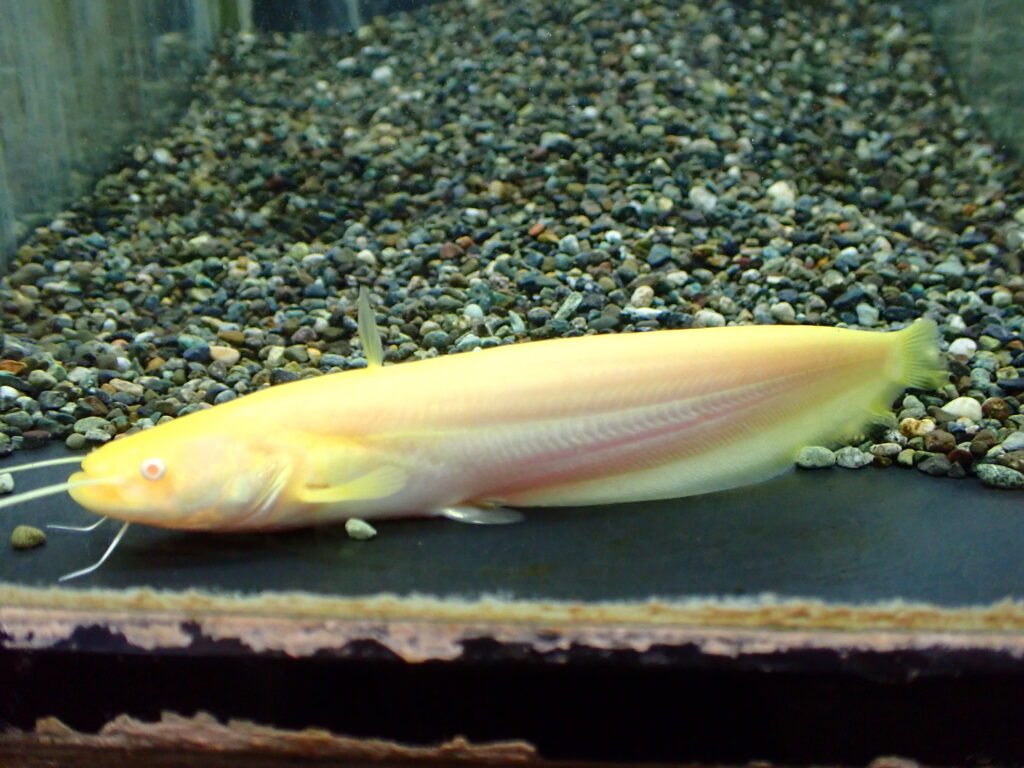 アルビノも1匹だけですが入荷しました。アルビノのナマズって神々しくてキレイですね!ヨーロッパオオナマズが飼えなくなってしまった今ではアルビノのシルルスってもう南方大口のアルビノしか選択肢が無いんですよね。まぁ日本産のマナマズのアルビノっていうのも全くいないわけではないですがまぁまずいないし、仮にいたとしてもすごい値段になるでしょうからね。というわけで黄金のナマズ(実際にはレモンイエローのような黄色ですが)縁起良さそうだしどなたかいかがですか??
