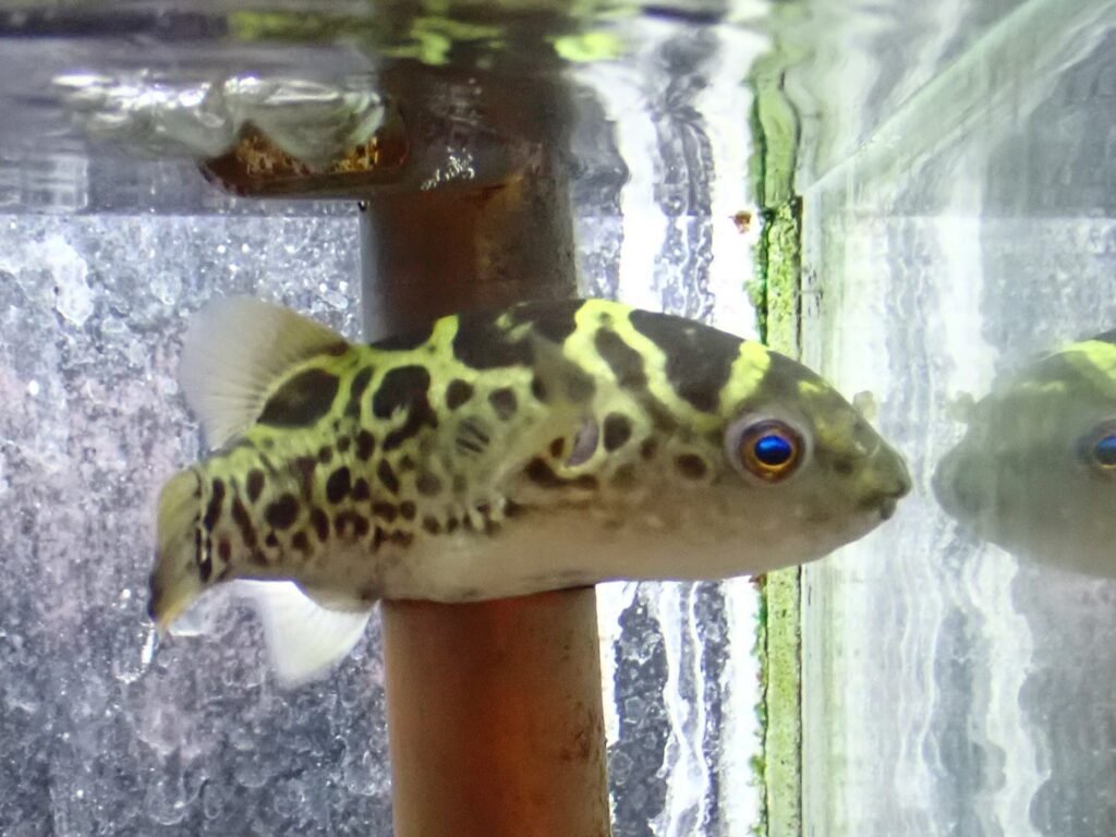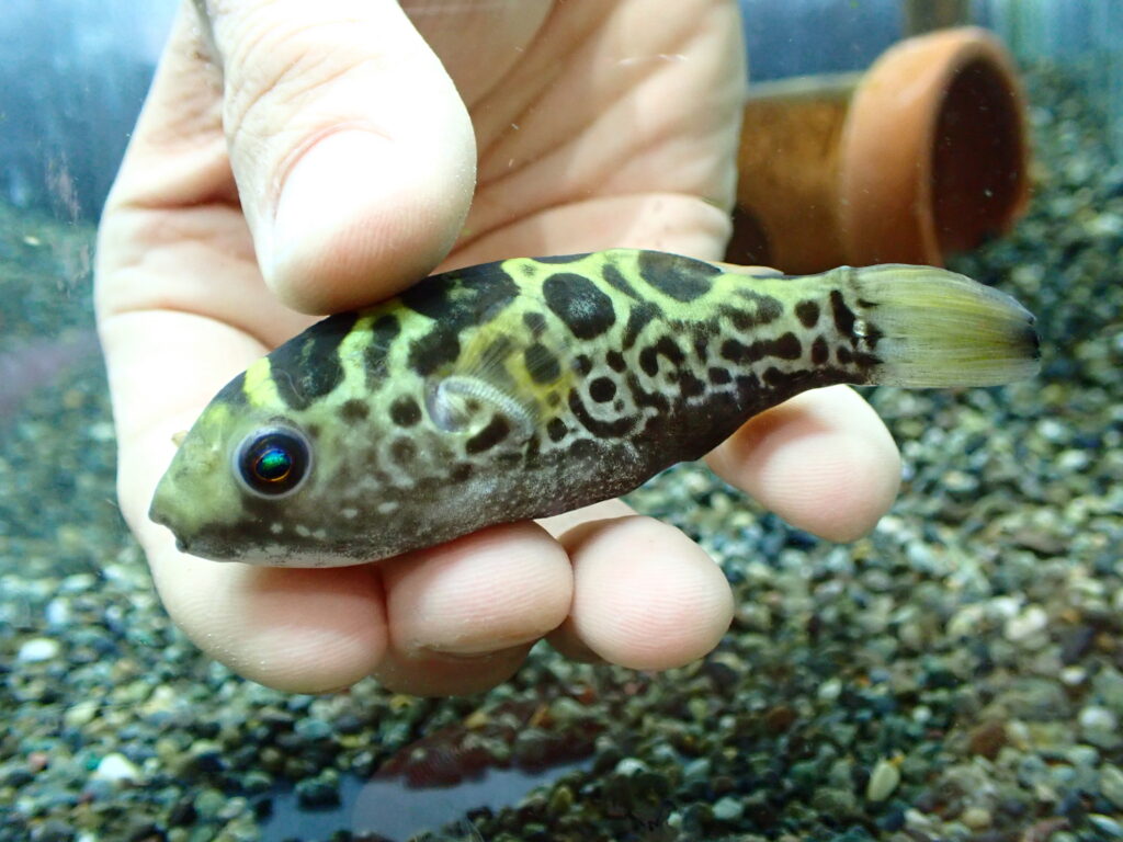 結構前に入荷しましたがホームぺージに載せ忘れてたました。しばらく店で飼い込んでありますので状態は良好で乾燥エビバクバク食べてます。マミズフグの名前ですが汽水です。でも丈夫な種類なのでちょっと塩入ってさえいれば塩分濃度などはあまり気にしなくても大丈夫です。