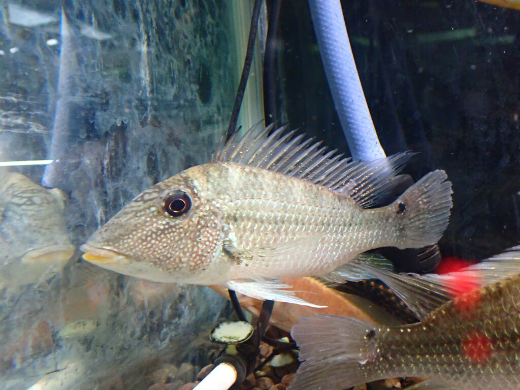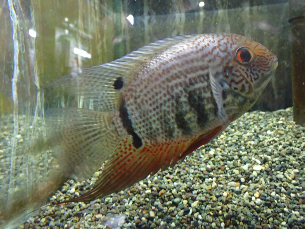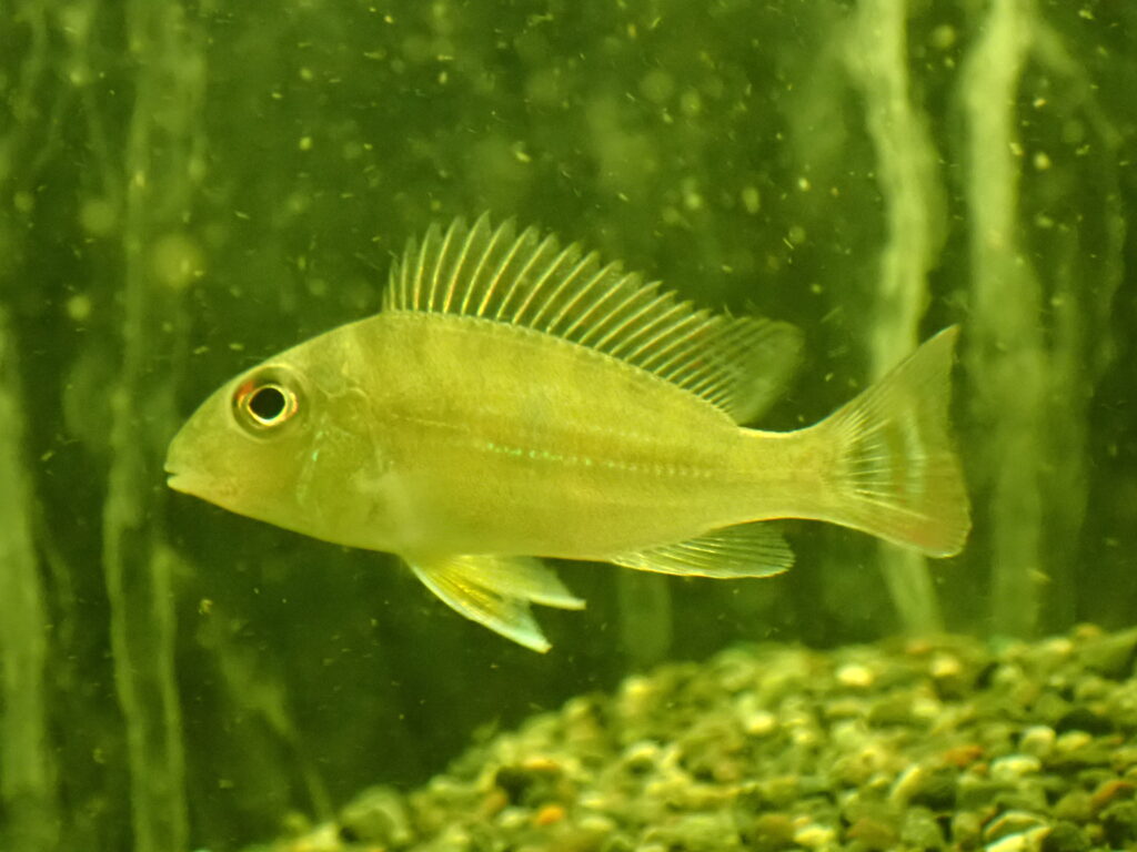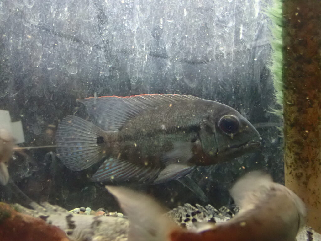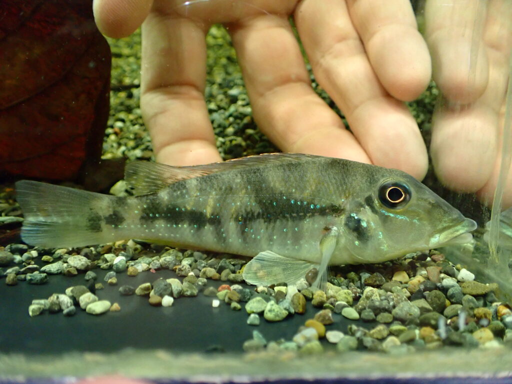 緑の発色がとてもキレイなシクリッド。まだ小さいので本来の発色を見せてくれるのはもう少し先ですが、こんなに鮮やかな緑色の淡水魚って他にいないんじゃないかな??画像だとかなり黒っぽくなっていますが実物はもっとキレイです。