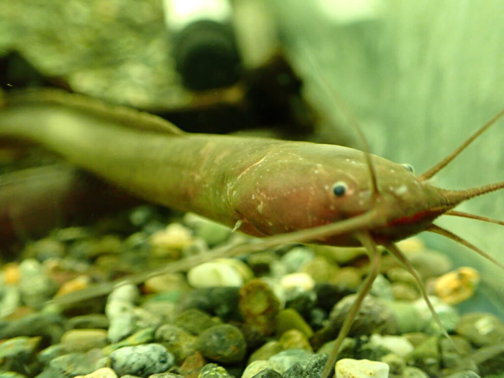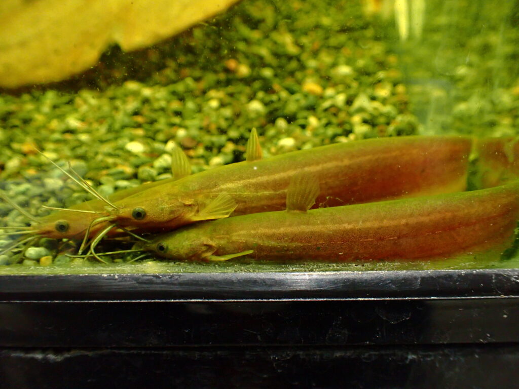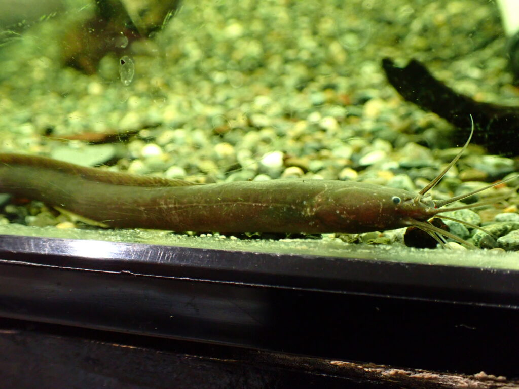 胸ビレ無くて細くてニョロニョロしたやつです。アフリカンイールの中ではよく見るタイプですが、大事に育てると意外と大きくなって見ごたえのあるナマズになります。個人的に大好きなのでオススメ!