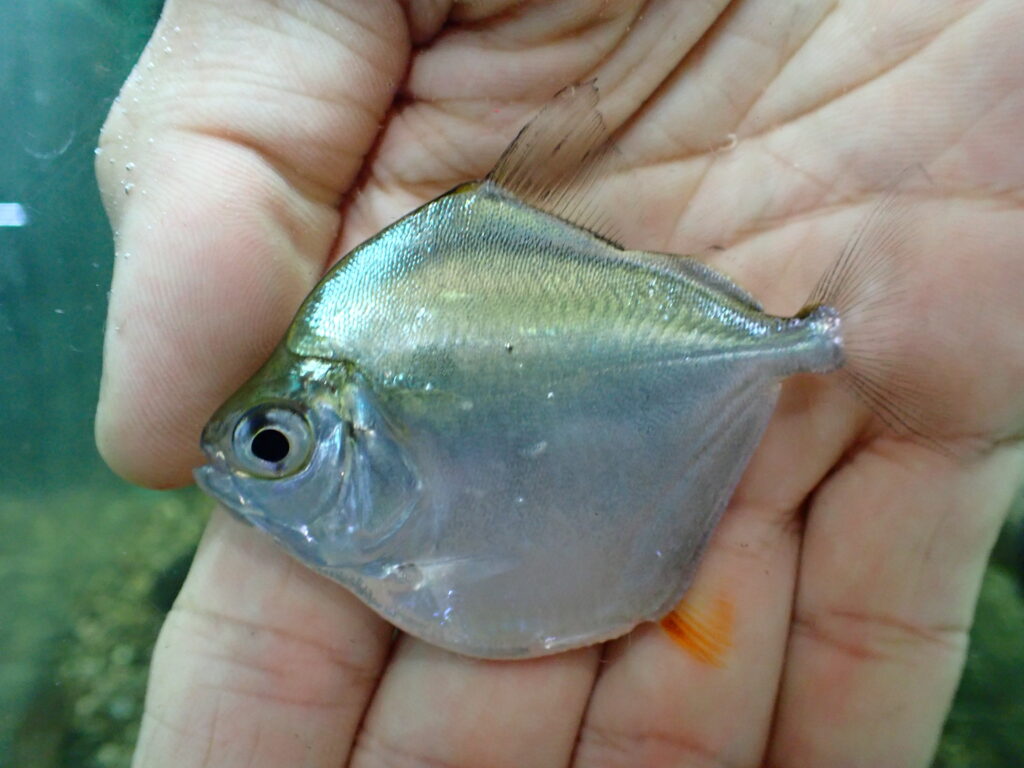かわいい小さめサイズ来ました。この魚のこのサイズは珍しいですね!タイ産のイシモチって前は着状態悪くてガリガリに痩せてるのばっかり来てたんですが、最近は良く太った元気な個体が来るようになりましたね。