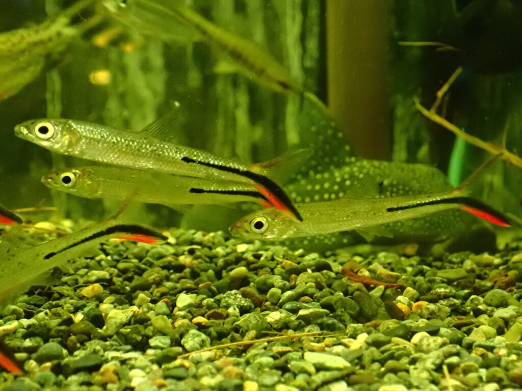 尾ビレの上まで赤くなるタイプのレッドテールヘミオダスです。このサイズでも尾ビレの発色はとてもキレイです。特に今回のは赤が濃くてすごく良いです!