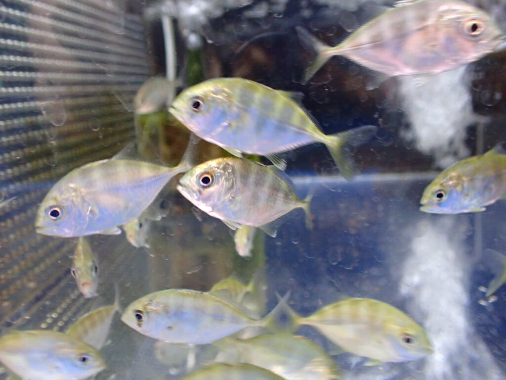 いわゆるメッキアジで、今回はロウニンアジとギンガメアジのミックスだと思います。淡水とありますが汽水で、現状では0,2%位で塩入れてあります。幼魚のうちは慣らせば淡水での飼育も可能なようですが、やはりいくらかでも塩が入っていた方が状態も安定して飼いやすいです。状態良く輸入された個体であればpH高めにして少し塩を入れてあげれば基本的には丈夫で飼いやすいですよ。よく泳ぐ魚なので痩せやすいです。なので幼魚のうちは特にしっかり餌を与えるようにしましょう!何匹か一緒にして群れで泳がせるととてもかっこいい魚です!