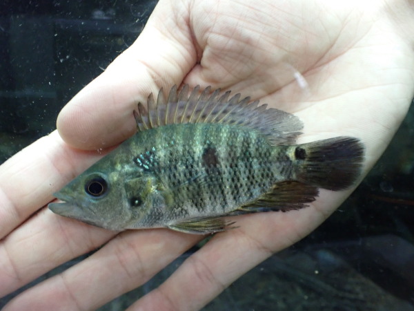 コロンビア産のバスケットマウスシクリッドです。意外と入荷が少なくて今回の入荷も結構久しぶりです。8cmと11cmの個体が1匹ずつの2匹しか来ていませんのでお探しだった方はお早めに!右上の画像です。画像の個体は11cmの個体です。