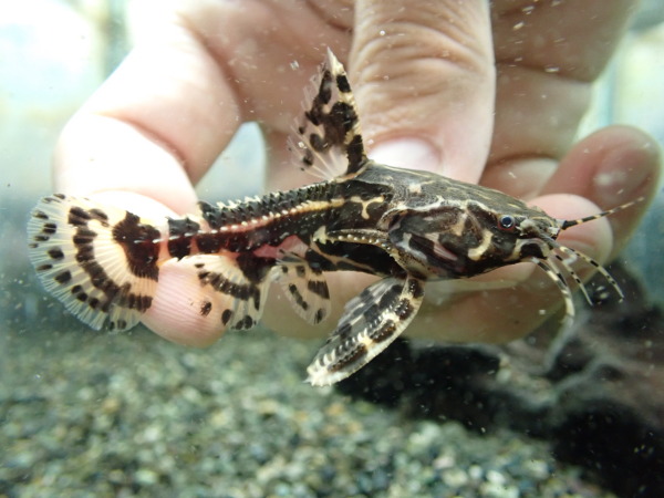 ヨシドラスと呼ばれるアカンソドラス系の謎ドラスの1種。ニューヨシドラスのインボイスで入荷しましたが何がニューなのか自分には分からないです、すみません・・・。ヨシドラスはすごく珍しいドラスなんでやはりというか、値段は結構高い・・・。今回問屋さんには大きいサイズと小さいサイズが輸入されてましたが小さいのはこれ1匹のみでした。大きいのも数は少なかったですが値段がもっと高かったからうちは小さい方をゲット。それに小さい方がキレイだったし。大きいのは側線の辺りに白いラインが1本入り背中に細かいスポットがちょいちょい入る感じでしたが、小さいのは側線のラインだけじゃなく頭の模様や体側のお腹側や背中側の模様もライン状につながっています。成長につれて途切れてスポット状になっていくのでしょうか?でも大きいのは白黒っぽい感じだったけど小さいのは模様の色が黄色いんですよね。もしかしたら違う種類なのかな?まぁ何にしても珍しいドラスで入荷は1匹のみ!小型ドラスのマニアの方はお見逃しなく!!左下の画像です。