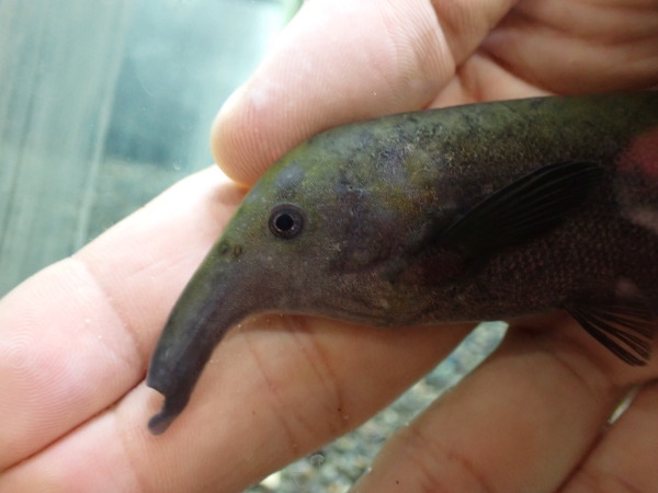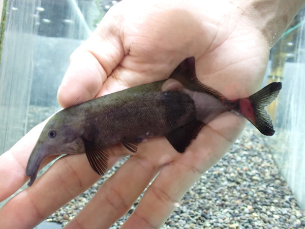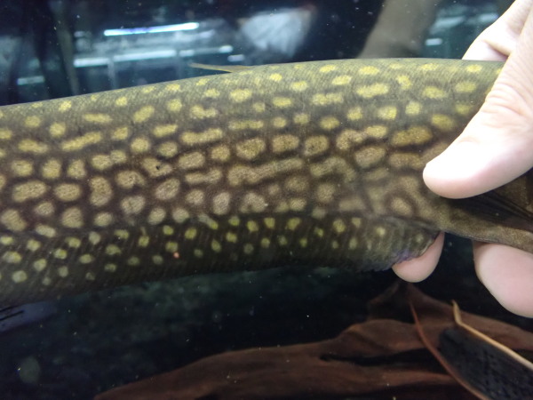 チャド産ということでベルギーのシッパー経由で輸入されたアロワナナイフ。インボイスはスターダストギャラクシーアロワナナイフでした。輸入元の話ではベルギーの業者はチャド産ということで普段アロワナナイフが来るような産地ではないこともあり新種ではないかとノリノリだったらしいですが、やはりと言うかアファーでしたね。でもスターダストギャラクシーなんて名前つけたくなるのも納得な超極美個体。普通フルスポットのタイプはギニアから来ますが、それでもここまでスポットがはっきりしたキレイな個体はまず来ないです。体色の地色は黒ではなくやや黄色っぽい感じでスポットも金色がかってます。1匹しか輸入されていないのでこの発色がチャド産の特徴なのかは判断できかねますが、いずれにしても超ハイレベルな個体なのは間違いないです。アロワナナイフはやや気の荒い魚ですがポリプやプレコなど底物の魚とであれば混泳も問題無いことがほとんどで、店頭でもプレコと混泳させています。サイズも大きくて見ごたえありますのでポリプとかアフリカの魚と混泳させたらかなり良い雰囲気だと思います!マニアの方、ぜひ!!上段、中段左の画像です。3つの画像は同一個体です。
