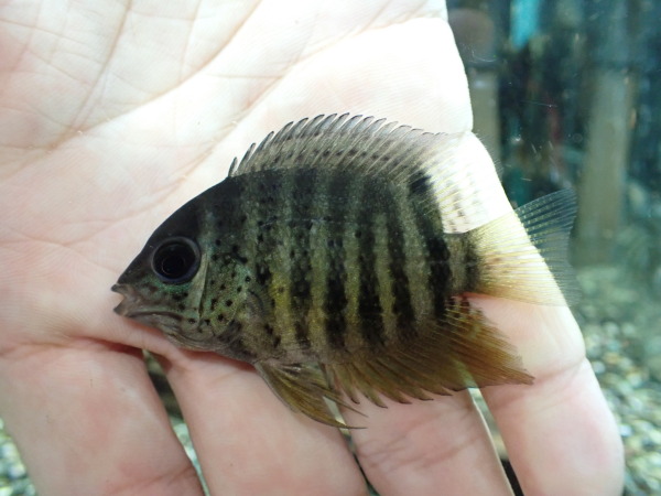 ペルー産のワイルドジュルパリ。頬の青いラインが特徴です。レウコとかダエモンに比べるとちょっと地味に思われるかもしれませんが、大事に飼い込むと全身にメタリックブルーの光沢が出てとてもキレイな魚になりますよ!