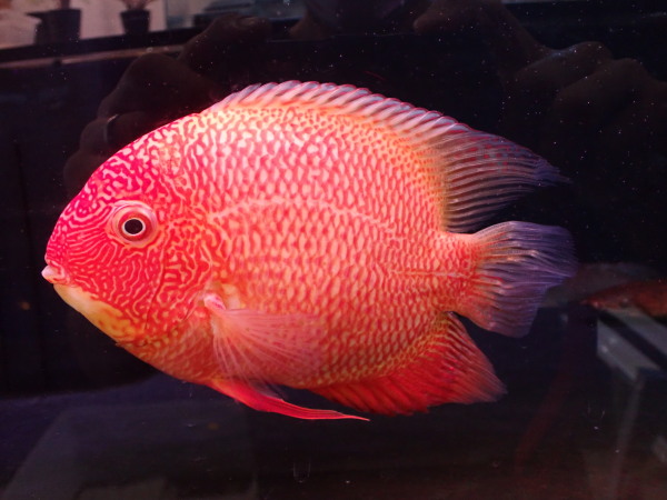 改良品種の真っ赤なセベラムです。サイズも大きいからすぐにでもアロワナとかとの混泳に使えると思います。欠点と言う程ではありませんがほんの少しだけ尾ビレの条に歪みありましたので大特価にしてあります。このサイズでこの値段はかなりお得ですよ!右下の画像です。