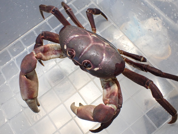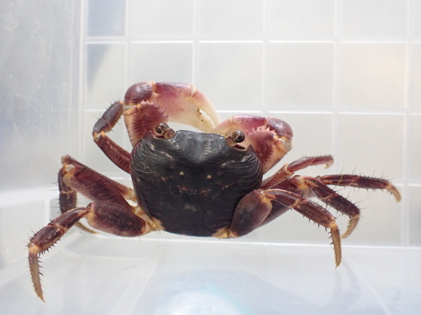 デカいです!甲幅は9cmですが足広げたら30cm近くありそうです!しかも足欠けとかない完品です!脱走にさえ気を付ければ飼育は難しくないです!名前の通りの紫のカラーリングがキレイな超厳ついオカガニ。めちゃくちゃカッコいいですよ!中段右の画像です。