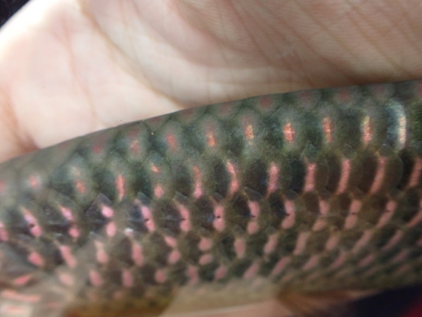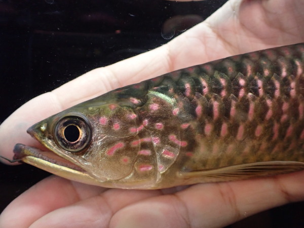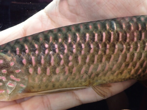 エラ蓋、鱗のピンクの模様がヤバいです!ここまでくるともはや別の魚ですね!実物の発色はかなりエグいですよ!このクラスは滅多に見られません!数年に1度仕入れられるかどうかのレベルです!ノーザンも極上の個体はここまでいくのかと思わせられる個体です!もちろん1匹のみ!マニアの方はお見逃しなく!!上段、中段、左下の画像です。5つの画像は同一個体です。背中の鱗まではっきりとピンクの模様出てます!