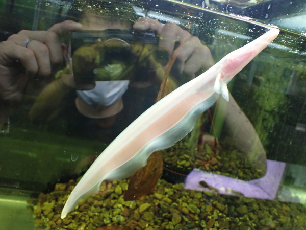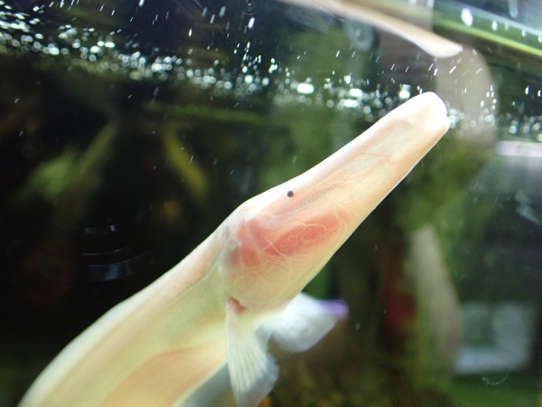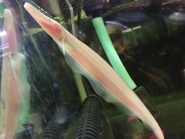 久しぶりの入荷!アルビノや白変個体を思わせるようなピンクがかった白い体色が特徴的なペルー産のナイフフィッシュです。滅多に輸入されない希少種で、いつも大きいサイズで輸入されるため輸送が難しく着状態が悪いことも多い魚。着状態が良ければ普通に冷凍赤虫食べてくれるので飼育も難しくないです。今回は状態良く届いているのでオススメです!ただしこれ系の魚全般に言えることですが水質の急変には注意が必要なので1度に多量の水換えとかはしない方が無難です。次回の入荷は未定!南米ナイフマニアの方はお見逃しなく!!上段、中段左の画像です。3つの画像は同一個体です。
