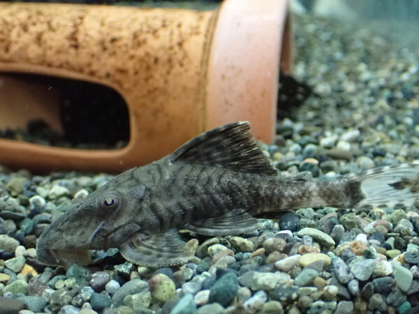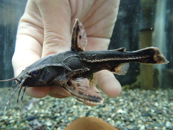 ベレン便で輸入されたアナドラスのようなナマズ。ペルー産のグリプスも在庫いますが色が全然違います。グリプスはサンドベージュというか薄い体色をしていますが、今回来たのは濃い焦げ茶っぽい感じの色をしています。尾ビレ短くなてますが再生しますのでご安心ください。入荷は1匹のみ!右上の画像です。