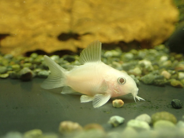 超かわいいです!コリドラスは普段扱っていませんが、ショートでかわいかったので仕入れてみました。これショートボディとして品種固定されているわけではありませんので激レアです!真っ白の体に黒い目(実際にはブドウ目かな?)が本当にパンダみたいですね!入荷は2匹のみ!今回輸入されたのもこの2匹のみ!売れ残ったら店で育てます!左下の画像です。