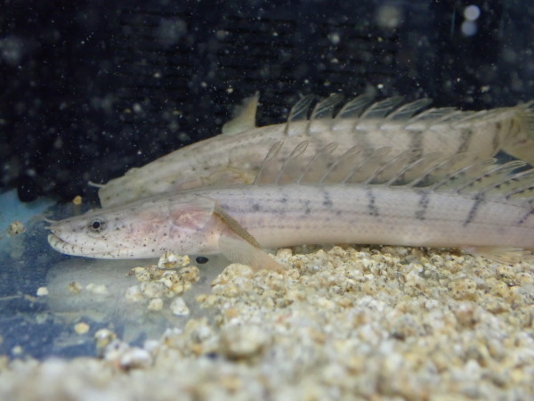 タンガニーカ湖産のアフリカンシクリッドと一緒にごく少数が輸入されたそうです。扁平な顔で超カッコいいです!落ち着いたらどんな色になるかはまだ分かりませんが、現状では肌色っぽい感じでマニアの方が旧タイプと呼んでいたタイプに近いかも?ちなみに入荷した個体全てがというわけではありませんが、よく泳いでます。アクアログに載ってるタンガニーカ湖産のコンギはこげ茶色の体色で細いバンドが入っていましたが、それと同じタイプなのかは不明です。仕入れが安かったので幻のタンガニーカ湖産がこんな値段でいいのかと逆に不安になりますが、まぁ安い分にはありがたいということで、気になる方はぜひ育ててみてください。入荷は少数のみですので早い者勝ちです!上段、中段左の画像です。