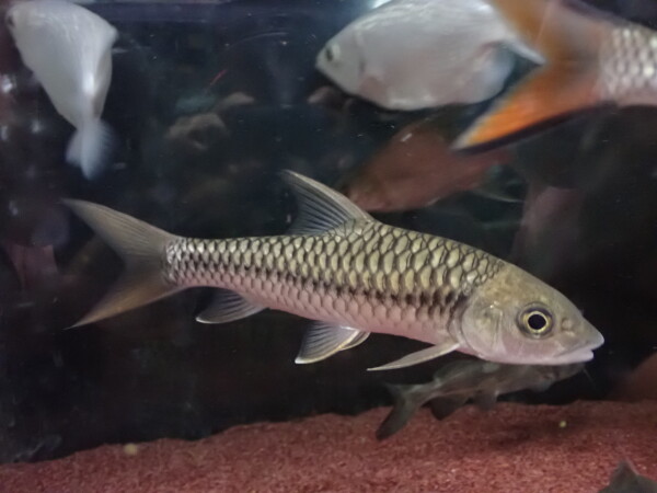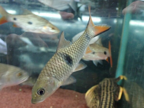 トールspのインボイスで入荷しましたが、おそらくトールシネンシス Tor sinensis だと思います。シネンシスと聞くと中国産を思い浮かべる方も多いと思いますが、実はメコン水系に広く分布している魚みたいです。ただし局所的な分布だったり個体密度がかなり低かったりで熱帯地域からの入荷はかなり稀。中国産は小さいのがたまに輸入されていて値段も全然安いですが、おそらく中国のとは個体群として全く別だと思います。中国のは銀色っぽい体で体側にラインが入りヒレは黄色味がかるような感じですが、タイやミャンマーのはヒレは赤っぽく成魚では側線から下も赤くなります。ミャンマー産のシネンシスは当店初入荷で実際に育てたことがないのでどうなるかは分かりませんが、きっと赤系のキレイなマハシールに成長するはず!入荷は1匹のみ!!右上の画像です。