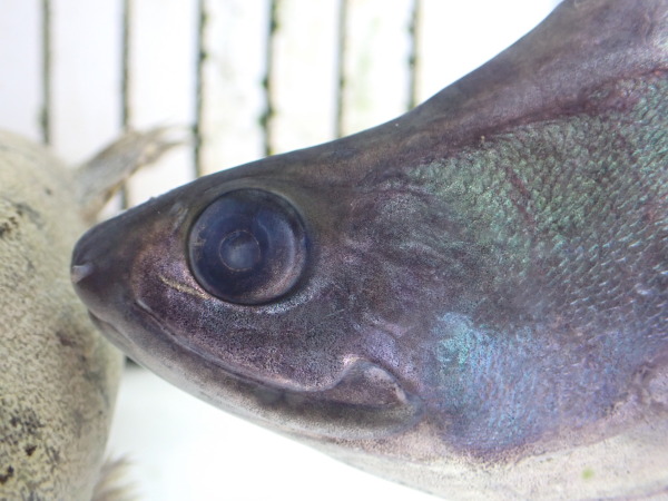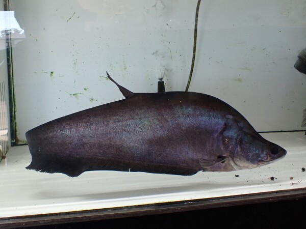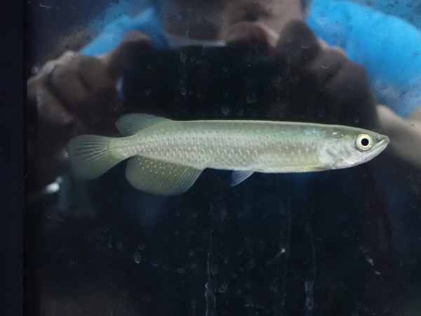 だいたい年末から1月頃の時期にだけ輸入されるオーストラリア固有のアロワナ。昨シーズンはうちの店には入荷ありませんでしたので2年ぶりの入荷だと思います。珍しくてすごく良いアロワナなんですが何故かそんなに人気も無いので、2年ぶりでもこいつの入荷を待ちわびてたぜ!っていう人も少なそうですが・・・。もともとヒゲが極端に短い種類なので、ヒゲがあるんだかないんだか分んないような個体も多いですがそういう魚です・・・。そこも人気が出ない理由の1つなのか??右上の画像です。