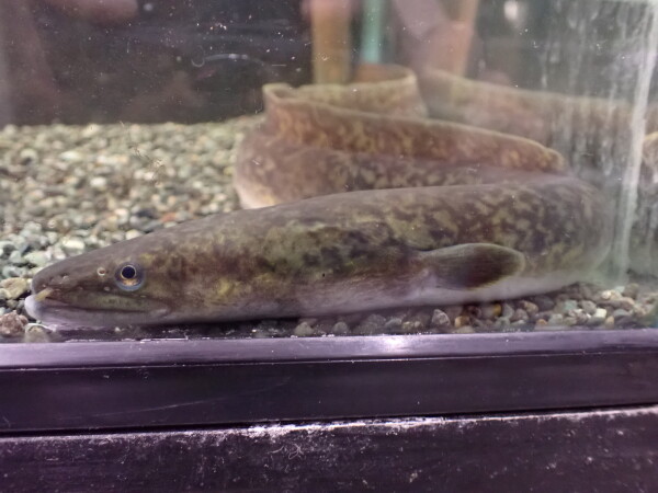 まず最初に、「銀化」とは白変とか黄変とかの突然変異的な色変わりではありません。数年前にウナギの産卵場所がマリアナ諸島付近であると発見されニュースになったこともあり、多くの方はウナギが海に出るということをご存じだと思いますが、ウナギも海に出るにはそれなりの準備が必要なんですね。体を海の環境でも順応できるように変化させるんです。それが「銀化」。海仕様に銀化したウナギはその名の通り体が銀灰色になり、目が大きくなって顔付きも変化します。一度銀化するともう元には戻りません。もちろん銀化は普通のウナギだけでなくオオウナギにも起こるわけで、そうなるとその特徴的な緑がかったマーブル模様は無くなり全く別の魚のように変化します。オオウナギは海で採集しているわけではありませんので銀化した個体が流通するのはかなり稀。過去に1度だけオーストラリア産のオオウナギ(Anguilla reinhardtii)の大型個体で銀化した個体を扱ったことがありますが、マルモラータの銀化個体は初入荷です!銀化したからと言って海水や汽水で飼育する必要はなく、純淡水で普通のオオウナギと同じように飼育できますので飼育も難しくありません。激レアな銀化個体でサイズも大きめですが値段は普通のオオウナギと同じ位になってますので超お買い得です!マルモラータの銀化個体なんてもう2度と入荷しないかもしれませんよ!?ウナギマニアの方、オオウナギ好きの方、お見逃しなく!!上段の画像です。2つの画像は同一個体です。