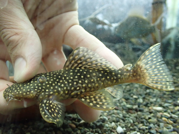 トカンチンス水系のはコロンビアのスーパーブラックドラゴンスタークラウンと違って体色はこげ茶色でスポットはクリーム色になるはずですが、この個体は体色が黒っぽくてスポット白いですね。でもスポットはすごい細かいのでスーパーブラックドラゴンスタークラウンとは雰囲気が全然違います。ちょっと変わった個体ですね!サイズ大きい割にお買い得で超オススメです!中段右の画像です。
